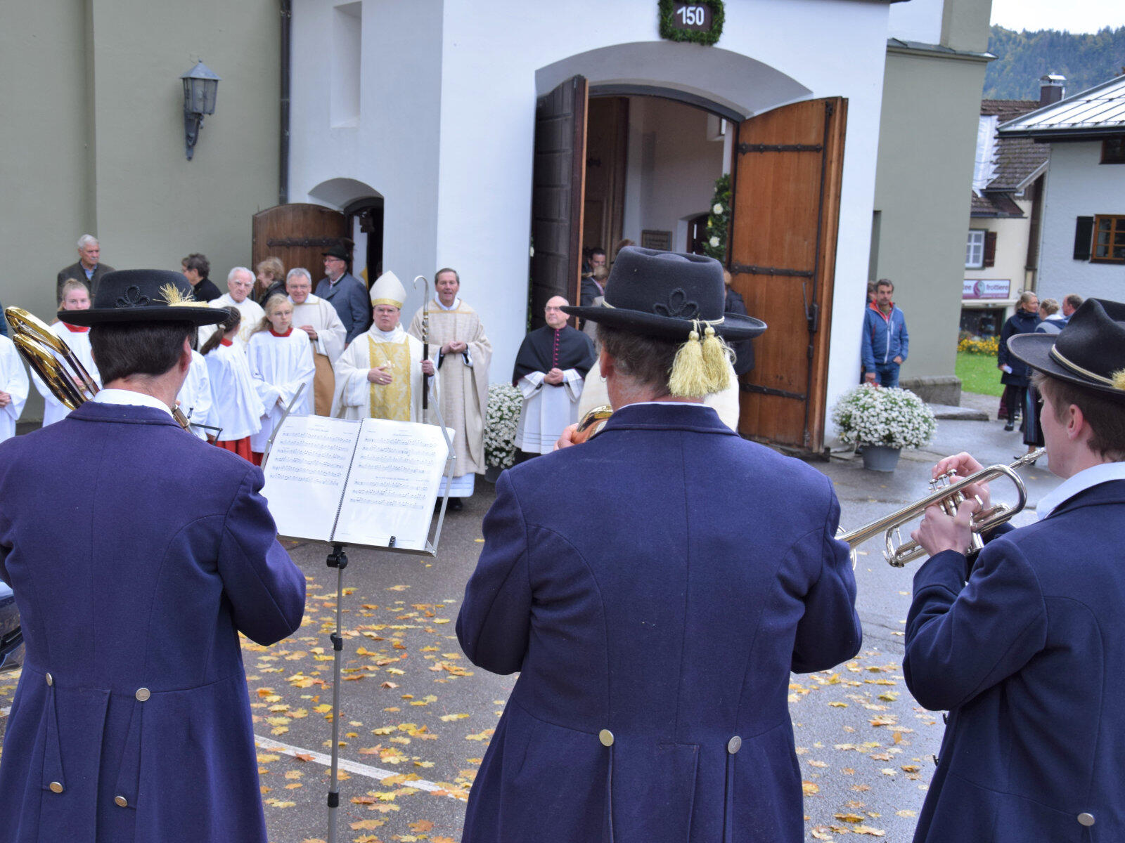 Am Schutzengelfest habe Bischof Pankratius von Dinkel (1811-94) am 2. Oktober im Jahr 1873 die Kirche St. Johann Baptist geweiht, erinnerte Martin Finkel zu Beginn des Pontifikalamtes, das vom Kirchenchor Concordia musikalisch gestaltet wurde. Pfarrer Hans-Ulrich Schneider (Rosshaupten) und der Ruhestandsgeistliche Karl Laurer (Missionspriester in Venezuela, momentan Bad Oberdorf) konzelebrierten. Zur Begrüßung des Bischofs spielten die Hindelanger Alphornbläser, eine Abordnung der Harmoniemusik brachte dem Ehrengast auf dem Kirchplatz ein Ständchen.