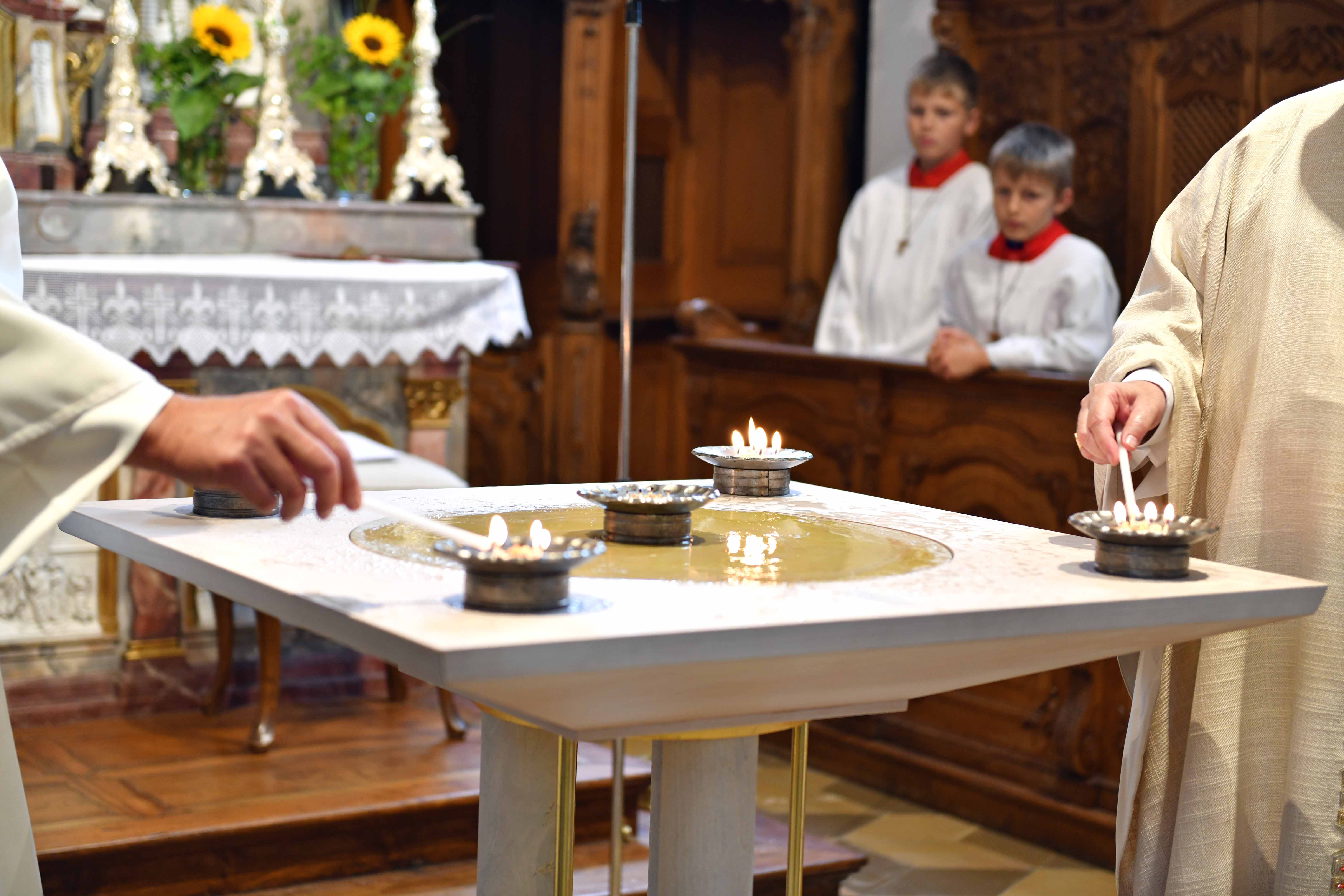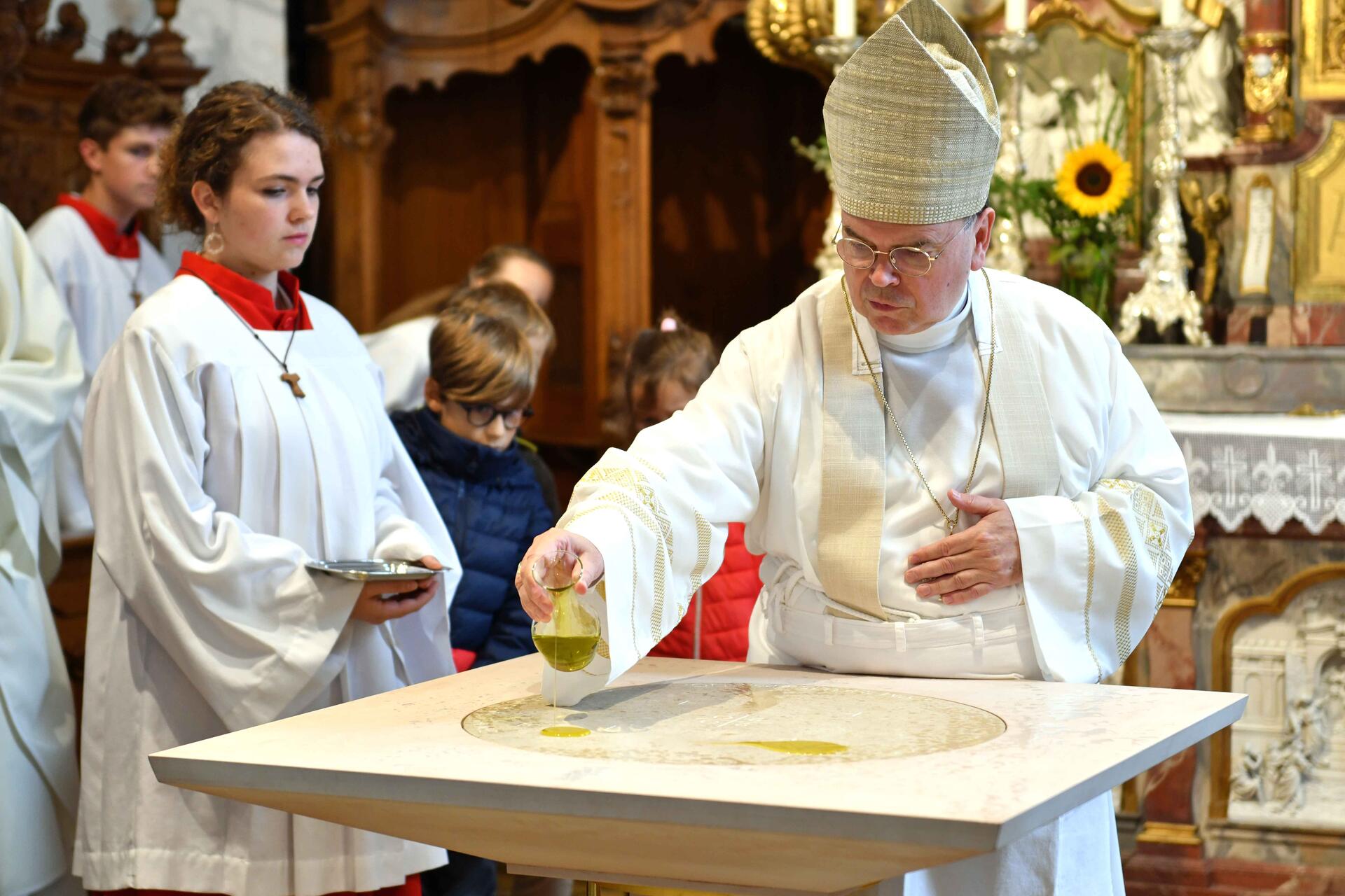 In seiner Predigt erschloss Bischof Bertram der Festgemeinde die Bedeutung der beiden sinnenfälligen Handlungen, die Teil einer jeden Altarweihe sind und bei den Gottesdienstbesuchern bleibenden unweigerlich Eindruck hinterlassen: Der brennende Altar und die Beisetzung von Reliquien. Zudem lud er die anwesenden Kinder ein, die Weihehandlung aus nächster Nähe zu beobachten: „Niemandem nehmt Ihr die Sicht, keinem den Platz. Ihr sollt schauen, was da vor sich geht. Ihr dürft verfolgen, was passiert. Ich verspreche Euch: Da wird sicher manches sein, was Ihr in der Kirche nicht erwartet.“