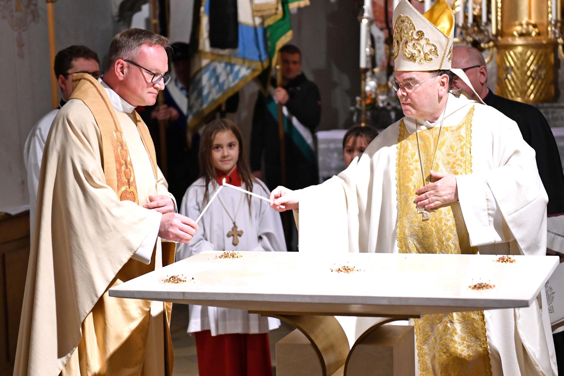 Auf die Predigt folgte der Ritus der Altarweihe, wo zunächst Reliquien des heiligen Bonifatius, dem „Apostel der Deutschen“, sowie des vor zwei Jahren seliggesprochenen und als „Influencer Gottes“ bezeichneten Carlo Acutis (1991-2006) beigesetzt wurden. Der junge Italiener, der mit 15 Jahren völlig überraschend an Leukämie verstorben war, habe eine für sein Alter ungewöhnlich tiefe Liebe zur Eucharistie entwickelt. Den Gottesdienstbesuchern empfahl der Bischof, sich am Beispiel des Seligen zu orientieren: „Suchen Sie die neu gestaltete Mitte in Ihrer Pfarrkirche regelmäßig auf! Empfangen Sie den Leib des Herrn – und tun Sie es nicht aus Gewohnheit, sondern bewusst und würdig! Es ist wie in einer Beziehung, die gepflegt sein will, ansonsten verkümmert sie!“ Danach besprengte Bischof Bertram den Altar mit Weihwasser und salbte die Altarmensa an den vier Ecken sowie in der Mitte mit Chrisamöl.
