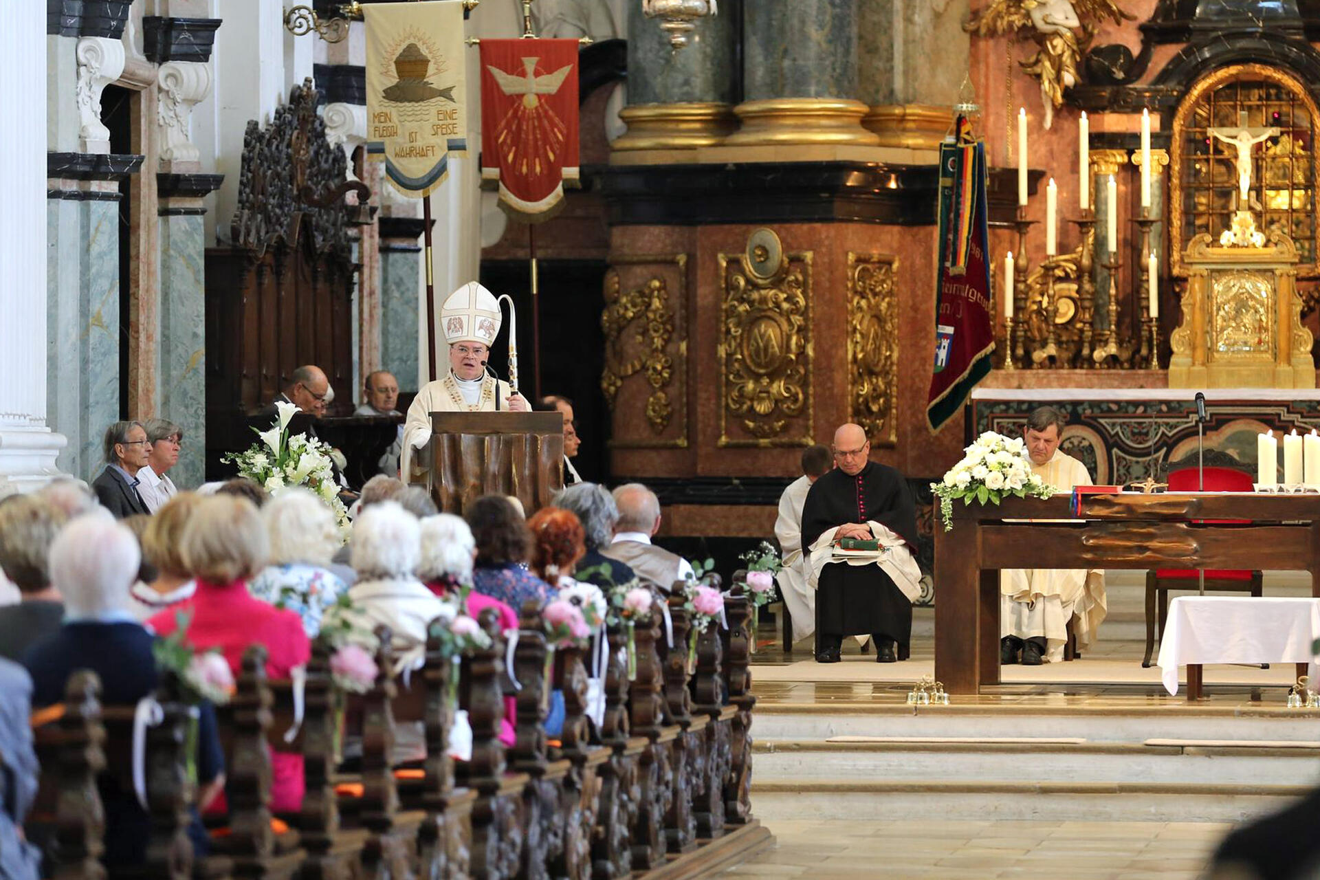 Bischof Bertram motivierte die Wallfahrer, egal welcher Generation sie sich zugehörig fühlten, sich nicht einfach an den Wegrand zu setzen und aufzugeben, sondern auf der „Pilgerreise unseres Lebens, die kostbare Stütze durch die Gemeinschaft“ zu erfahren. Ziel dieser Reise sei die ewig-alte und die neue Heimat zugleich: „Das Leben bei dem, der uns geschaffen hat, von dem wir ausgegangen sind und der uns am Ende der irdischen Wanderschaft mit offenen Armen empfängt“, sagte er zu den Wallfahrern, die selbst oder deren Eltern in Folge des Krieges ihre Heimat verlassen mussten.