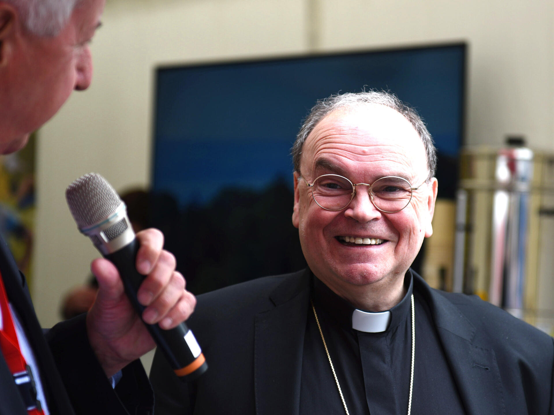 Am ersten Tag der Kirchenmeile auf dem 102. Katholikentag in Stuttgart stehen die einzelnen Stände im Mittelpunkt des Interesses. Das Bistum Augsburg präsentiert sich mit dem Blick auf das große Ulrichsjubiläum 2023/24, das im Juli kommenden Jahres eröffnet werden wird. Ein gutgelaunter Bischof spielte bei den Ulrichsspielen am Stand mit - und als es beim Würfeln darum ging, welche Eigenschaften des heiligen Ulrich man sich selbst zuschreiben darf, würfelte Bischof Bertram "beharrlich" - ein Attribut, das für den 62. Nachfolger des heiligen Ulrich sehr passend schien: "Auch ein Bischof muss beharrlich sein - und ich hoffe, ich bin es."