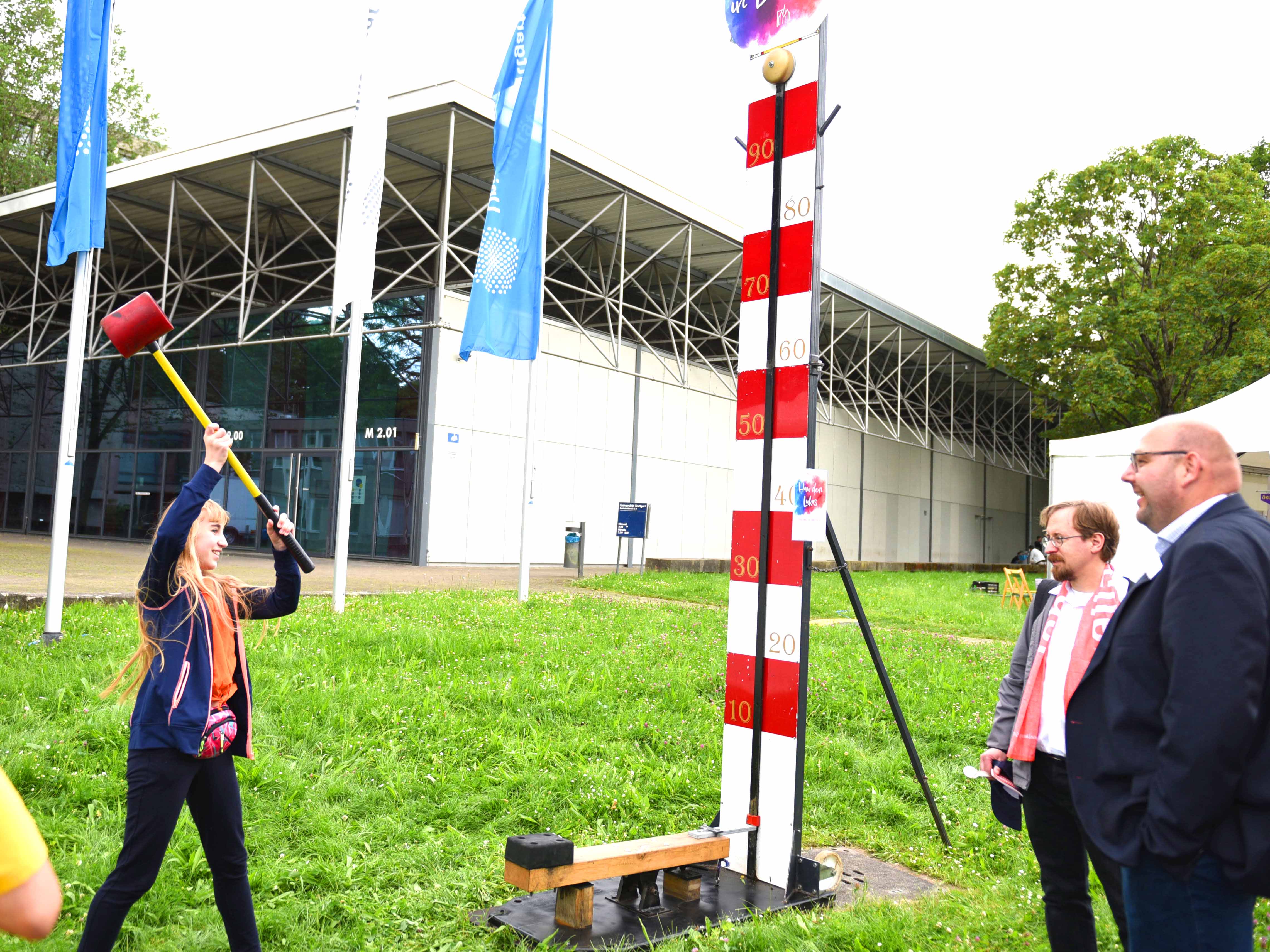 Trotz geringerer Anmeldezahlen bei diesem Katholikentag waren die Gassen am Feiertag gut besucht. Die Bistümer haben sich viele verschiedene Angebote einfallen lassen, vom Gestalten einer Blumenwiese beim Erzbistum Bamberg über ein "Hau den Lukas" beim Bistum Limburg bis zu einer virtuellen Tour, die die Besucherinnen und Besucher durch den Aachener Dom unternehmen können.