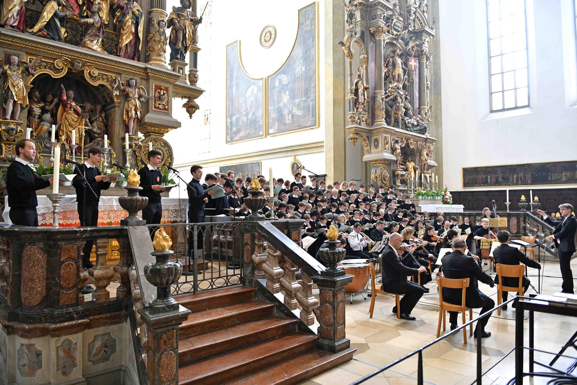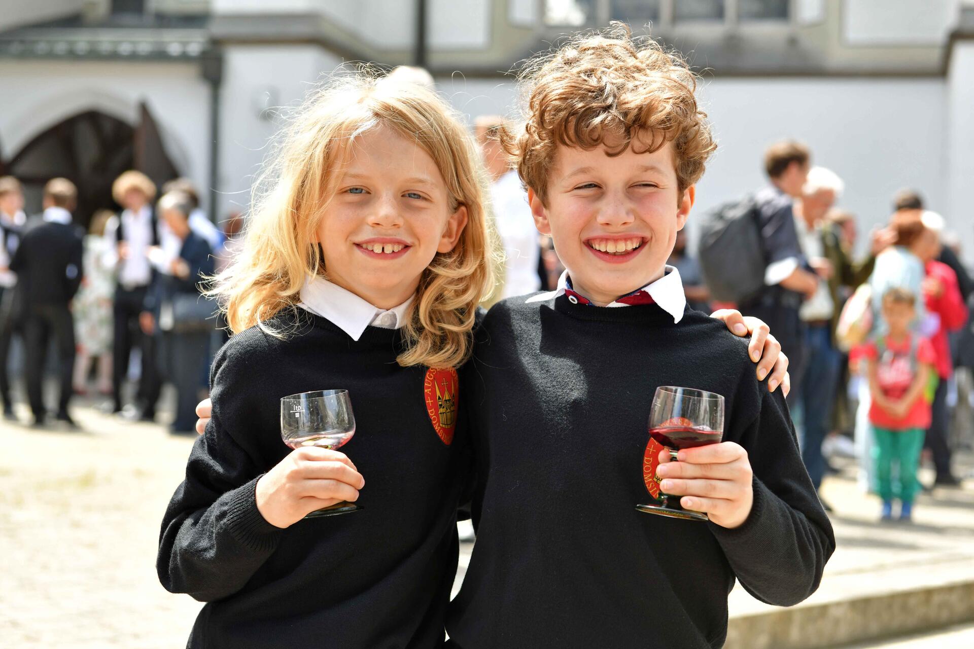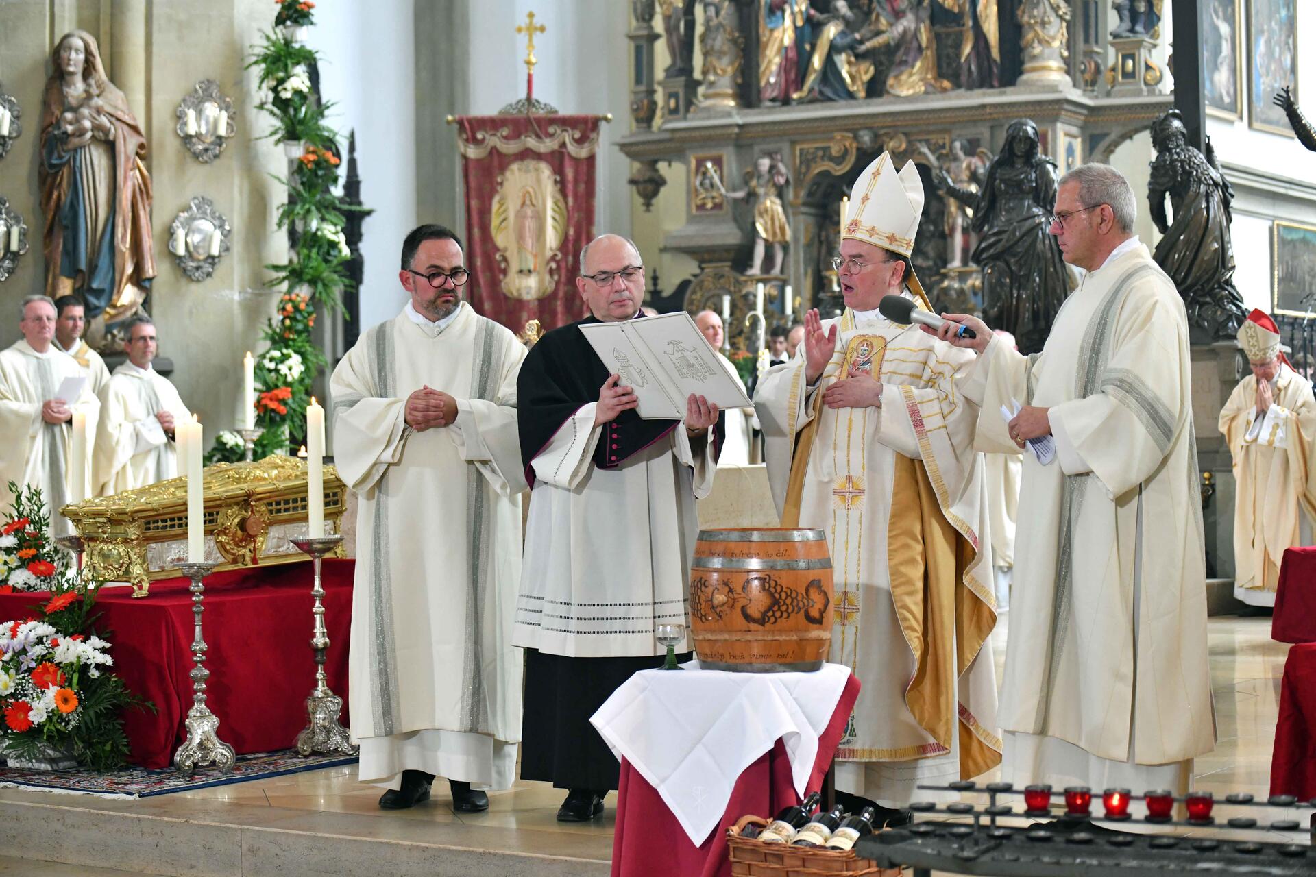 Zuletzt lud Bischof Bertram noch zu einem alten Brauch ein. Über Jahrhunderte hinweg sei in der sogenannten „Ulrichsminne“ bezeugt gewesen, dass die Gläubigen am Festtag des hl. Ulrich aus dem Ulrichskelch Wein trinken konnten. In Anlehnung an diese zeitweise verloren gegangene Tradition segnete der Bischof am Ende des live bei K-TV übertragenen Gottesdienstes Wein und ließ ihn an die Gottesdienstbesucher verteilen: „Trinket die Güte des hl. Ulrich, unseres mächtigen Fürsprechers bei Gott! Sein Leben der Gastfreundschaft sei uns Ermutigung und Zuspruch! Prosit, Sancte Udalrice! Amen.“ Der Bischof feierte das Pontifikalamt, bei dem auch Wallfahrtsgruppen aus den Pfarreiengemeinschaften Starnberg und Lechfeld anwesend waren, gemeinsam mit seinem Amtsbruder Franjo Komarica aus der bosnischen Diözese Banja Luka. Die Messe wurde von den Augsburger Domsingknaben und dem Domorchester unter der Leitung von Stefan Steinemann von Mozarts Krönungsmesse musikalisch gekrönt, wie Bischof Bertram zum Schluss des Gottesdienstes hervorhob und die Gläubigen zum Applaus animierte.