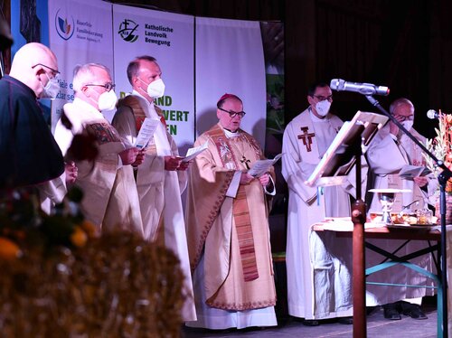 Neben dem Bischöflichen Zeremoniar, Domvikar Ulrich Müller, waren beim Gottesdienst in der Maschinenhalle auch der Pfarrer der PG Kaufbeuren, Bernhard Waltner, Verbändereferent und kommissarischer Landvolkseelsorger, Pfarrer Dominik Zitzler, Pfarrer Alois Linder, Vorstandsmitglied der Bäuerlichen Familienberatung und Pfarrer Anton Siegel als Mitglied im Diözesanverstand der Landvolkbewegung im Bistum Augsburg dabei.