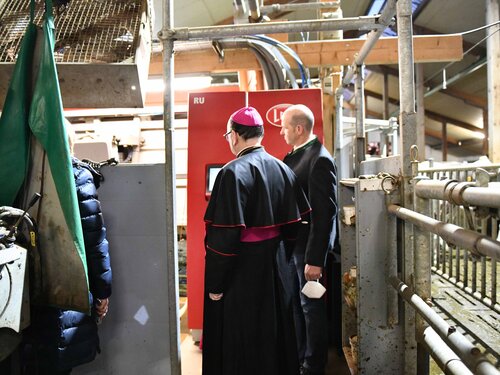 Wahrlich „Stallgeruch“ hatte der Festgottesdienst, den Bischof Dr. Bertram Meier am heutigen Samstagabend in der Maschinenhalle eines Bauernhofs in Großkemnat bei Kaufbeuren gefeiert hat. Anlass seines Besuchs war das 25-jährige Jubiläum der Bäuerlichen Familienberatung im Bistum Augsburg. Bereits vor der Messe nahm sich der Bischof bei einem Hofrundgang ausführlich Zeit für die Anliegen der Bauernfamilie und stattete den Tieren im Stall einen ganz persönlichen Besuch ab.
