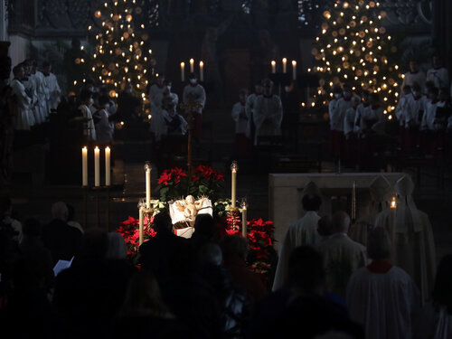 In seiner Predigt zum Hochfest der Geburt des Herrn am 25. Dezember stellte Bischof Bertram Weihnachten als „Fest des Wortes“ vor. An Weihnachten sei das göttliche Wort Kind geworden: „Gottes Wort ist einfach, klein, kurz und knapp, dass es in eine Krippe passt. Das Wort ist Kind geworden.“ Diese Botschaft sei an keine Konfession gebunden, sondern habe vielmehr die Kraft, Grenzen zu sprengen. „Ist das nicht die große Klammer für die Ökumene und ein Anknüpfungspunkt für den Dialog der Religionen“, stellte der Bischof als Frage in den Raum.