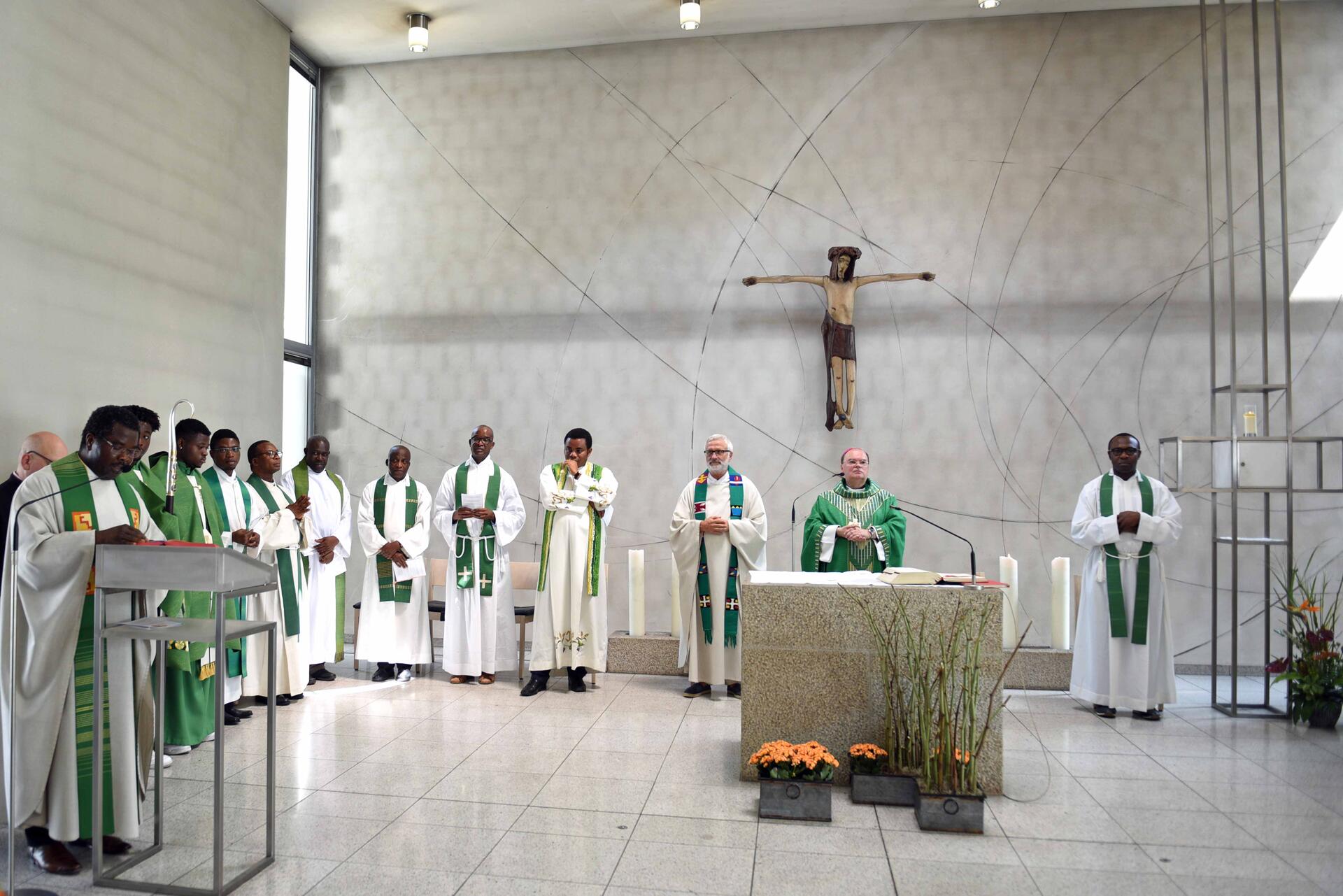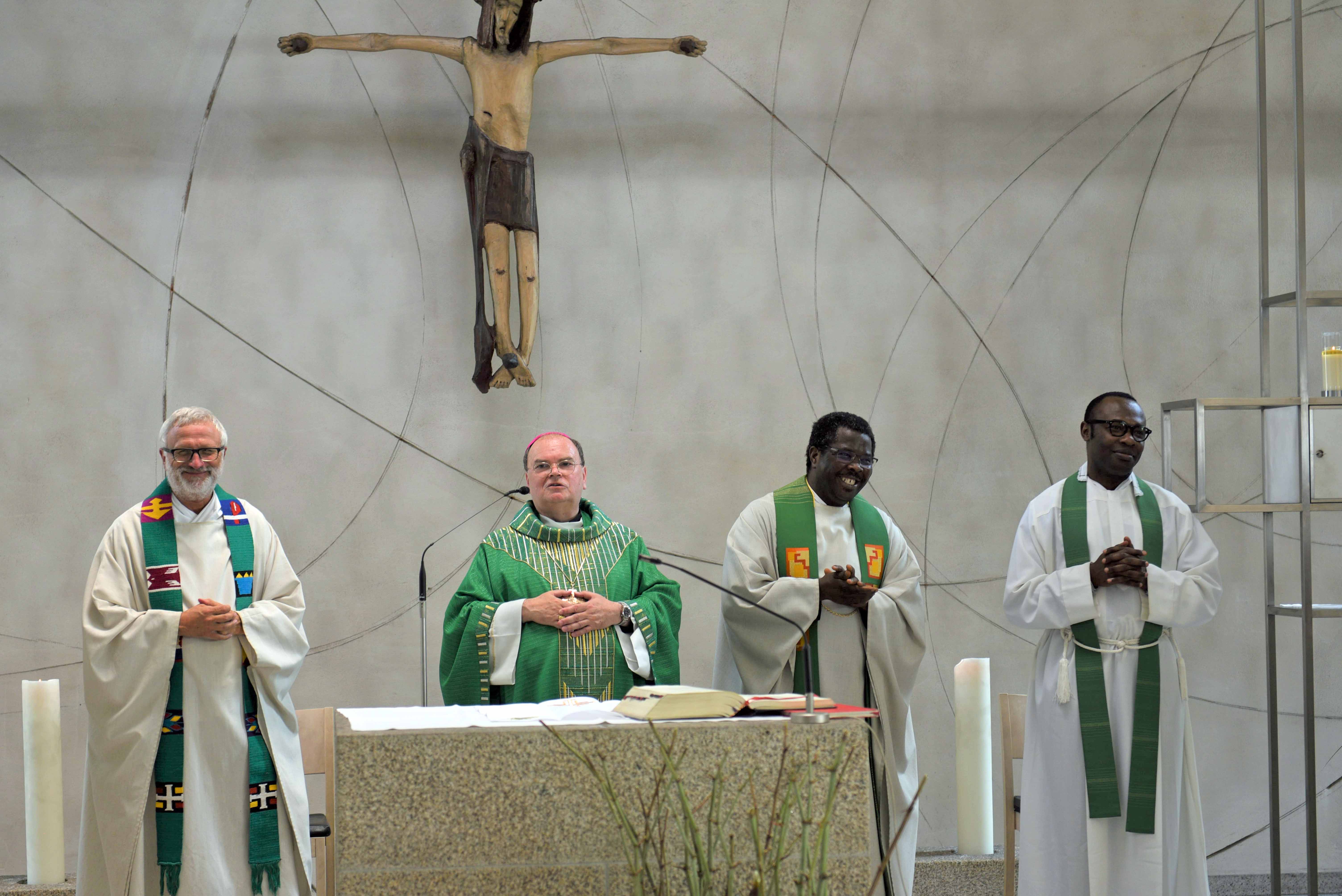„Zusammen singen, gemeinsam Gott loben, miteinander feiern“ war auf der Einladung zum Pfarrfest der Afrikanischen Gemeinde Augsburg zu lesen. Eine Aufforderung, der an diesem Sonntagnachmittag nicht nur Frauen, Männer und Kinder mit afrikanischen Wurzeln folgten. Eröffnet wurde das Fest durch einen feierlichen Gottesdienst mit Bischof Bertram im Thaddäus-Zentrum in Kriegshaber – viersprachig, mit bunten Gewändern, Trommelklängen und Tanz. Bei seiner in drei Sprachen gehaltenen Predigt thematisierte der Bischof die Wichtigkeit des Betens und die innige Beziehung zu Gott.