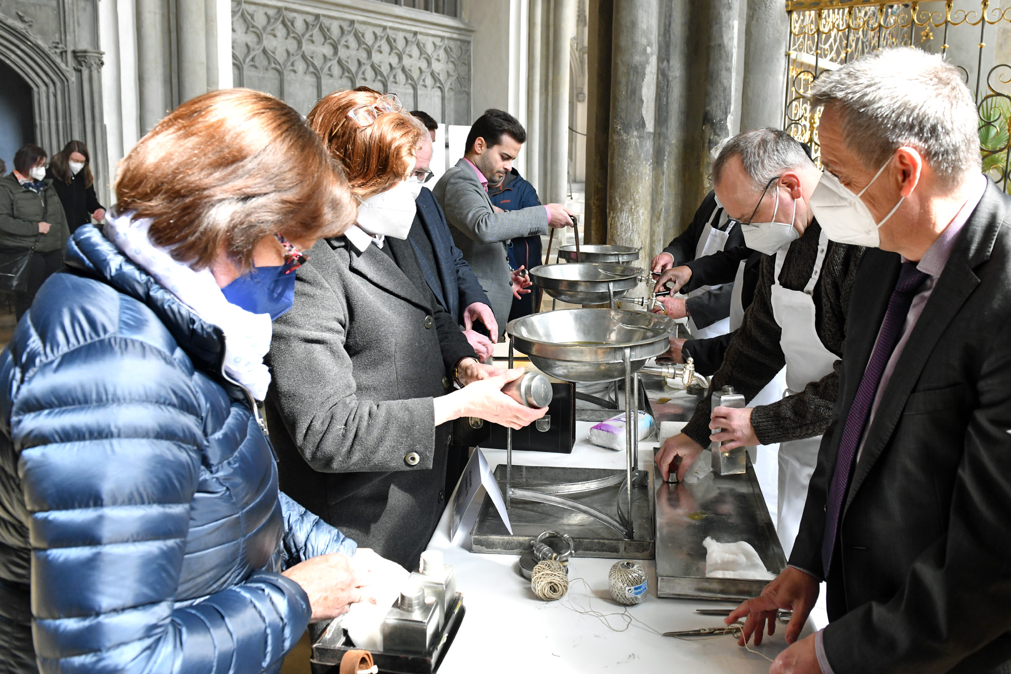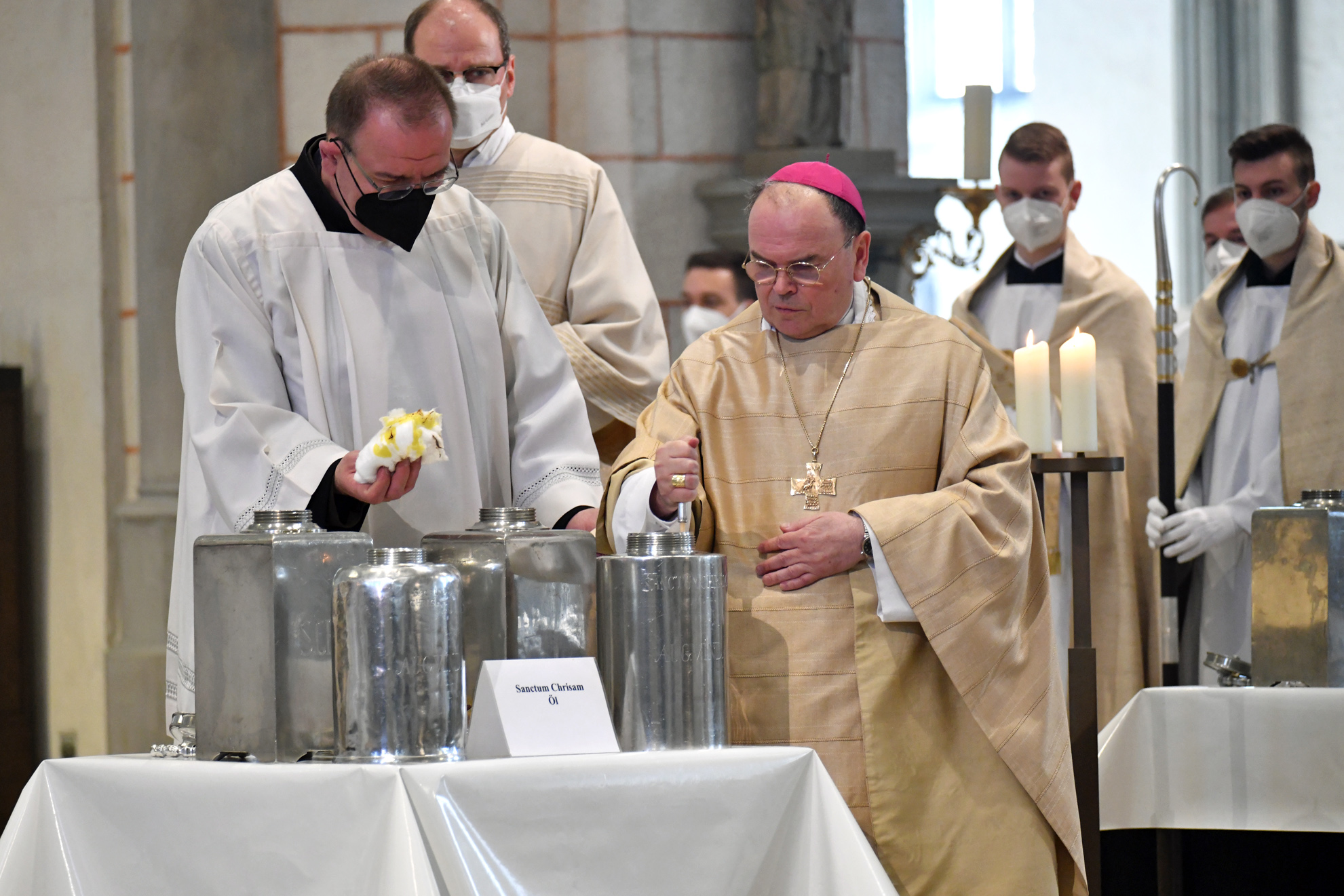 Im Anschluss an die Predigt und die Erneuerung der Bereitschaft zum priesterlichen Dienst weihte Bischof Bertram die Öle, die dazu in großen Behältnissen in einer Prozession in den Altarraum getragen wurden: Das Katechumenenöl brachten Mitglieder des Ritterordens vom Heiligen Grab zu Jerusalem zum Altar, das Krankenöl Mitarbeiterinnen und Mitarbeiter der Klinikseelsorge und das Chrisamöl schließlich zwei Ständige Diakone. Im Anschluss an die Chrisam-Messe wurden die heiligen Öle, insgesamt waren es 100 Liter, in kleinere Gefäße abgefüllt, versiegelt und an Frauen und Männer aus den einzelnen Dekanaten verteilt. An sie gerichtet sagte der Bischof: „Bringen wir nicht nur das duftende Öl in verschlossenen Koffern! Öffnen wir unsere Herzen für Christus, damit wir selbst Boten des Herrn werden, die seinen Wohlgeruch verbreiten, den Duft der Wahrheit, des Lebens und der Liebe.“