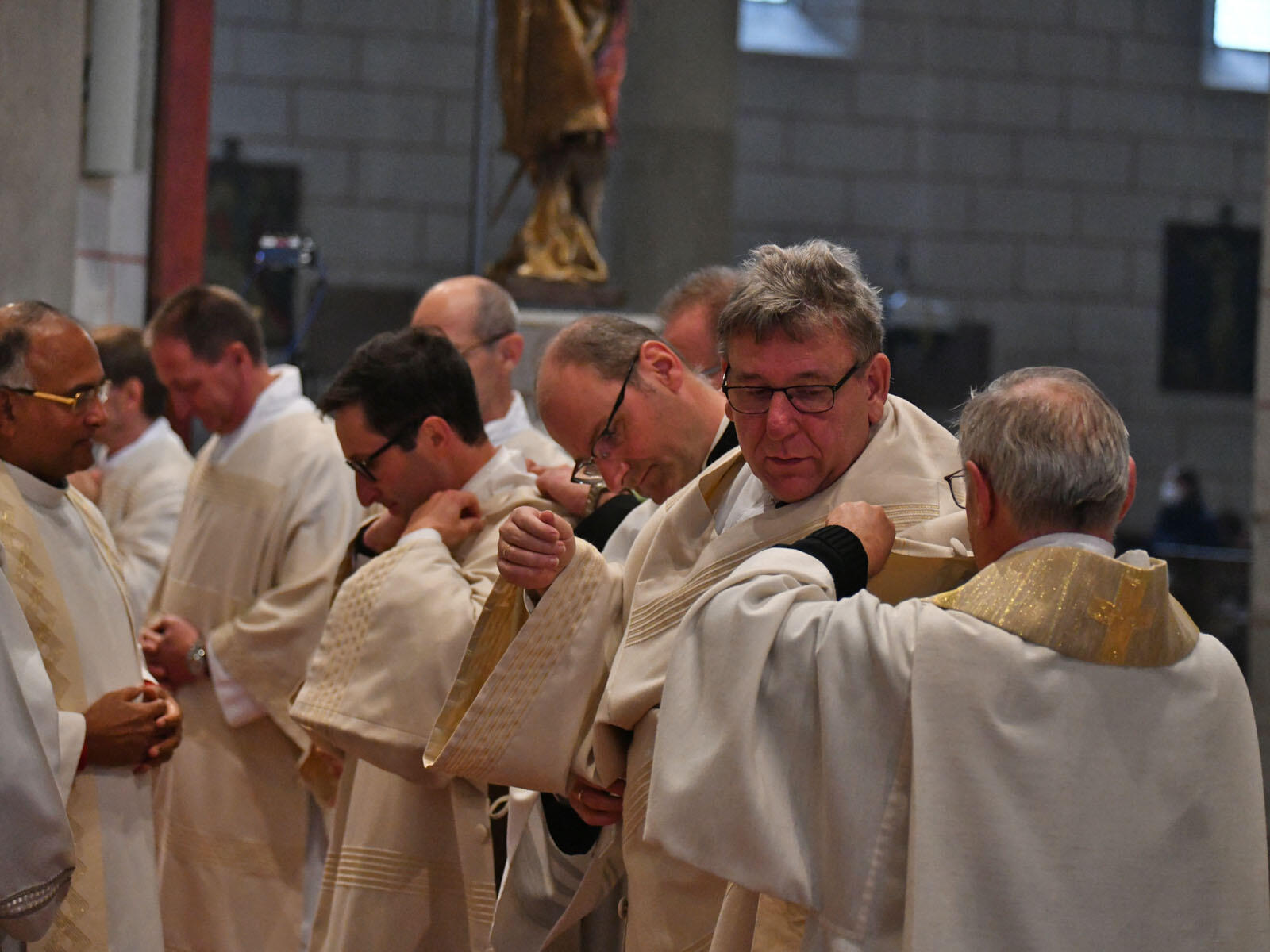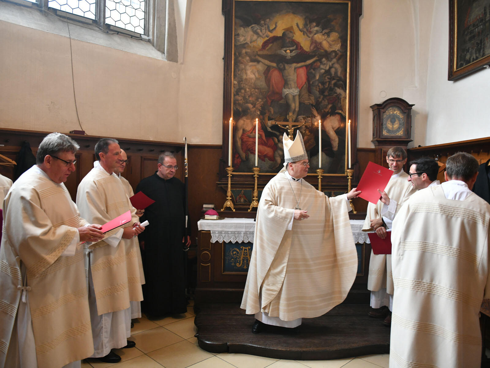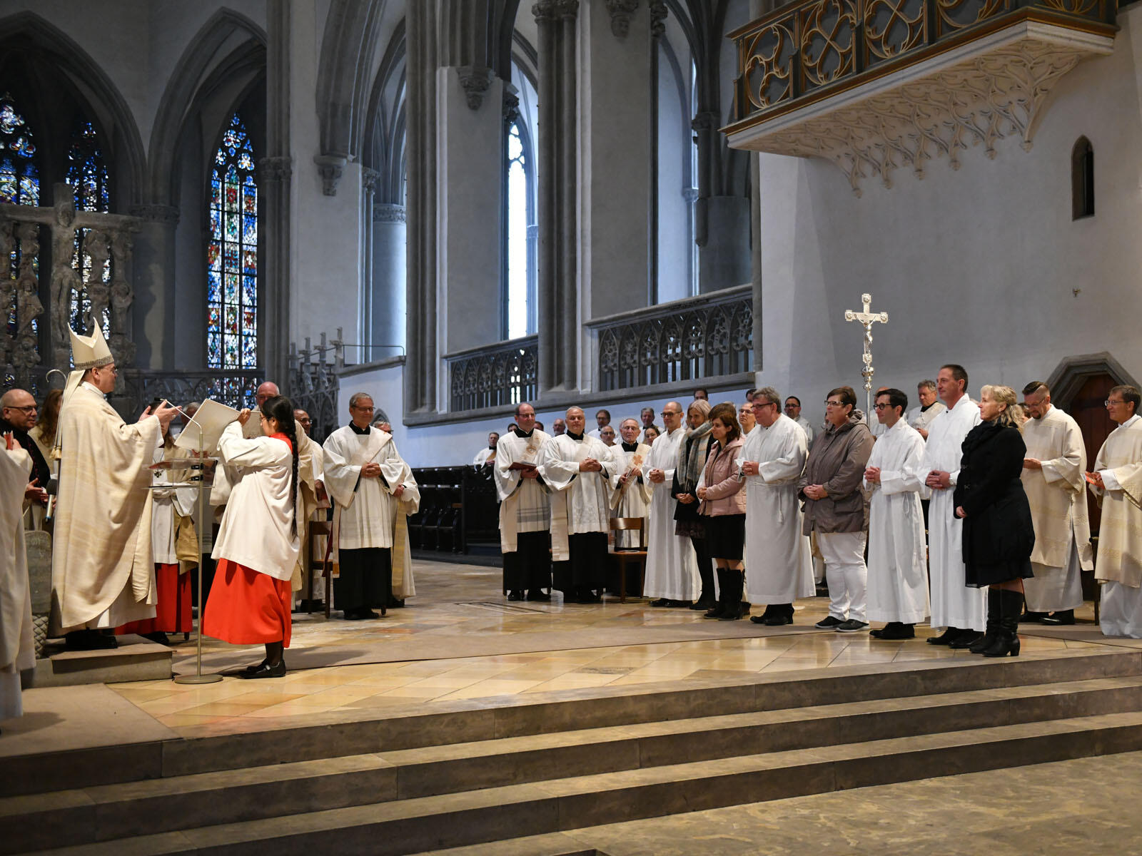 Auch die Ehefrauen der Weihekandidaten bestätigten während der Weiheliturgie mit ihrem „Ich bin bereit“ die Frage des Bischofs nach der Bereitschaft, ihre Ehemänner bei deren Dienst zu unterstützen. Schon in seiner Predigt brachte Bischof Bertram den Ehefrauen gegenüber seine Wertschätzung zum Ausdruck: „Danke, wenn Sie Ihren Mann, Ihren Vater und Bruder, Ihren Kollegen und Freund in seinem neuen Amt mittragen. Das braucht Umstellung.“ Es liege auch an den Familien, dafür zu sorgen, dass die Diakone ihr Augenmaß behielten und den richtigen Blick bewahrten.