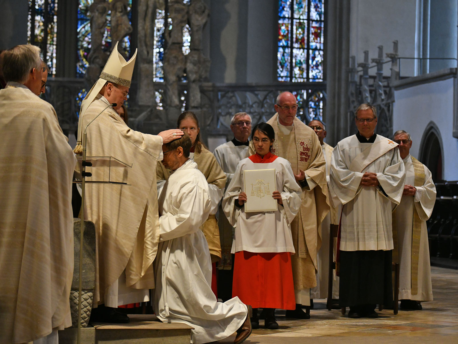 Nach der Predigt folgte die eigentliche Weiheliturgie, in der Bischof Bertram den fünf Männern unter Handauflegung und Gebet das Sakrament der Diakonenweihe spendete. In den sogenannten ausdeutenden Riten wurde ihnen Stola und Dalmatik als liturgisches Gewand ihres neuen Amtes angelegt und ihnen vom Bischof das Evangelium verkündet mit den Worten: „Empfange das Evangelium Christi: Zu seiner Verkündigung bist du berufen. Was du liest, ergreife im Glauben, was du glaubst, das verkünde und was du verkündest, das erfülle im Leben“.