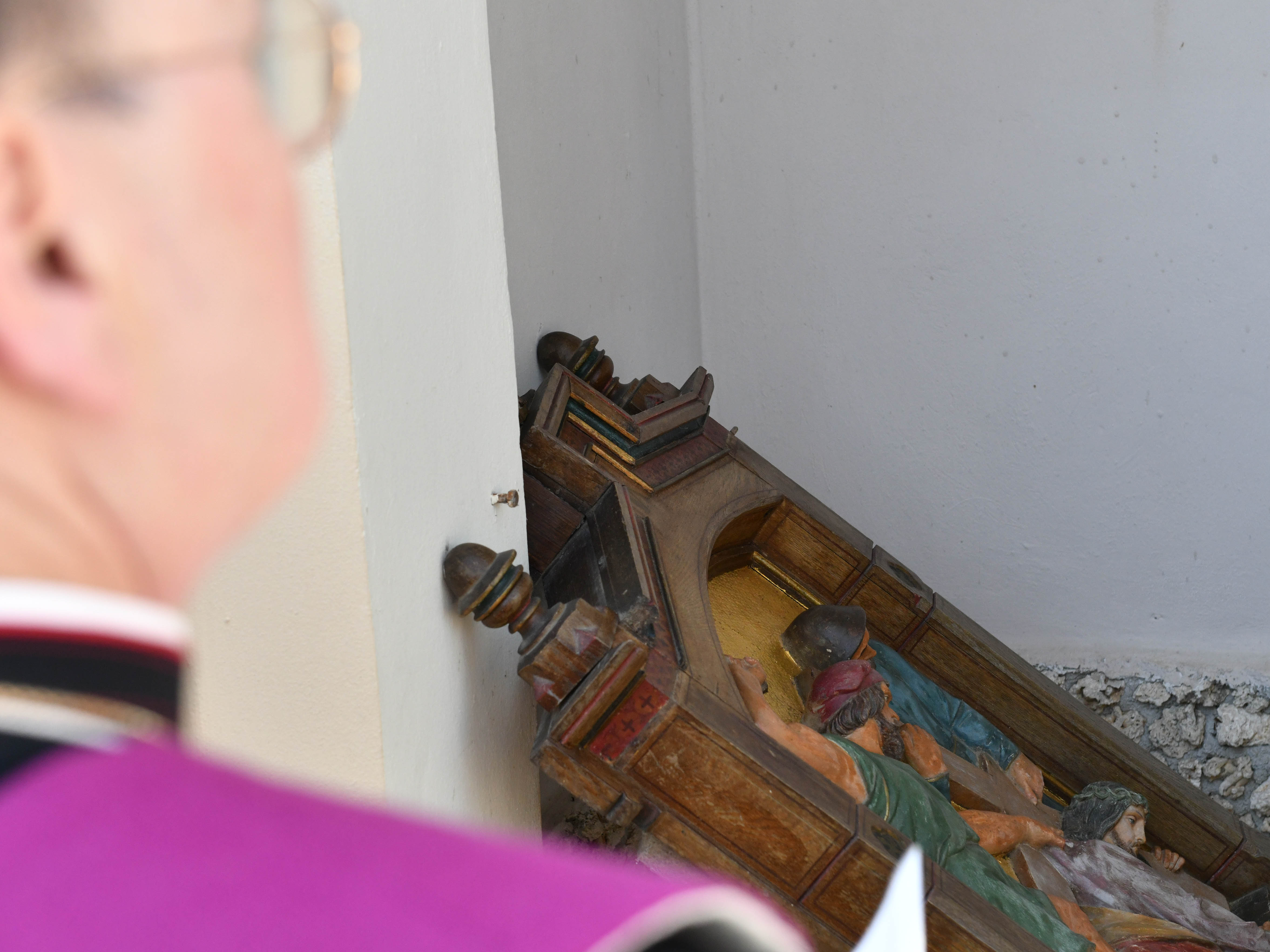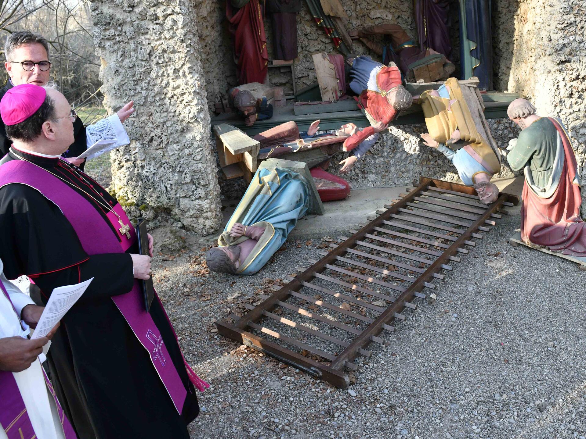 Mit einer emotionalen Kreuzwegandacht in Wettenhausen hat Bischof Dr. Bertram Meier auf die Zerstörung des Kalvarienbergs reagiert. Mehr als zweihundert Gläubige gingen mit Bischof Bertram gemeinsam am späten Sonntagnachmittag den Kreuzweg und gaben ein eindrucksvolles Zeugnis ihres Glaubens.