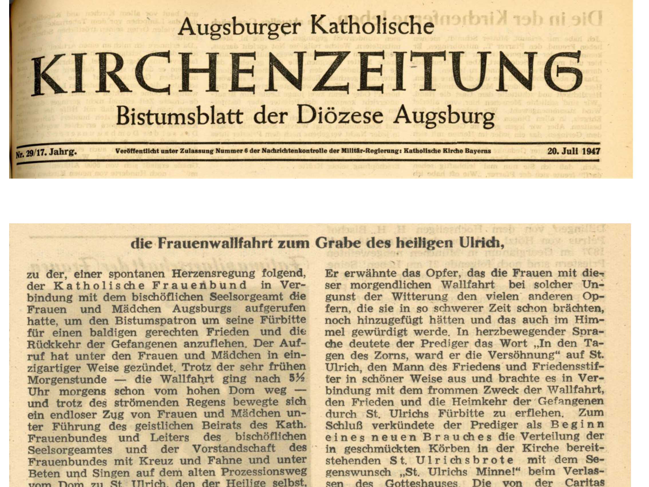 Es war kurz nach dem 2. Weltkrieg, im Jahr 1947, als sich zum ersten Mal in den frühen Morgenstunden zahlreiche Frauen und Mädchen vom Dom zur Ulrichsbasilika aufgemacht haben. In einer Friedenswallfahrt dankten sie für das Ende des Krieges und baten den hl. Ulrich um seine Fürsprache für die Rückkehr der Gefangenen. Heute, 75 Jahre später, lebt diese Tradition im Rahmen der Ulrichswoche Jahr für Jahr fort. So haben sich auch am heutigen Mittwoch mehrere hundert Frauen, die vielfach aus den Zweigvereinen des Frauenbunds nach Augsburg gekommen waren, betend und singend, mit Kreuz und Fahnen auf den Prozessionsweg gemacht. In einem feierlichen Pontifikalamt mit dem Bischof gedachten sie der langen Wallfahrtsgeschichte und setzten ein deutliches Zeichen für Frieden und Versöhnung.