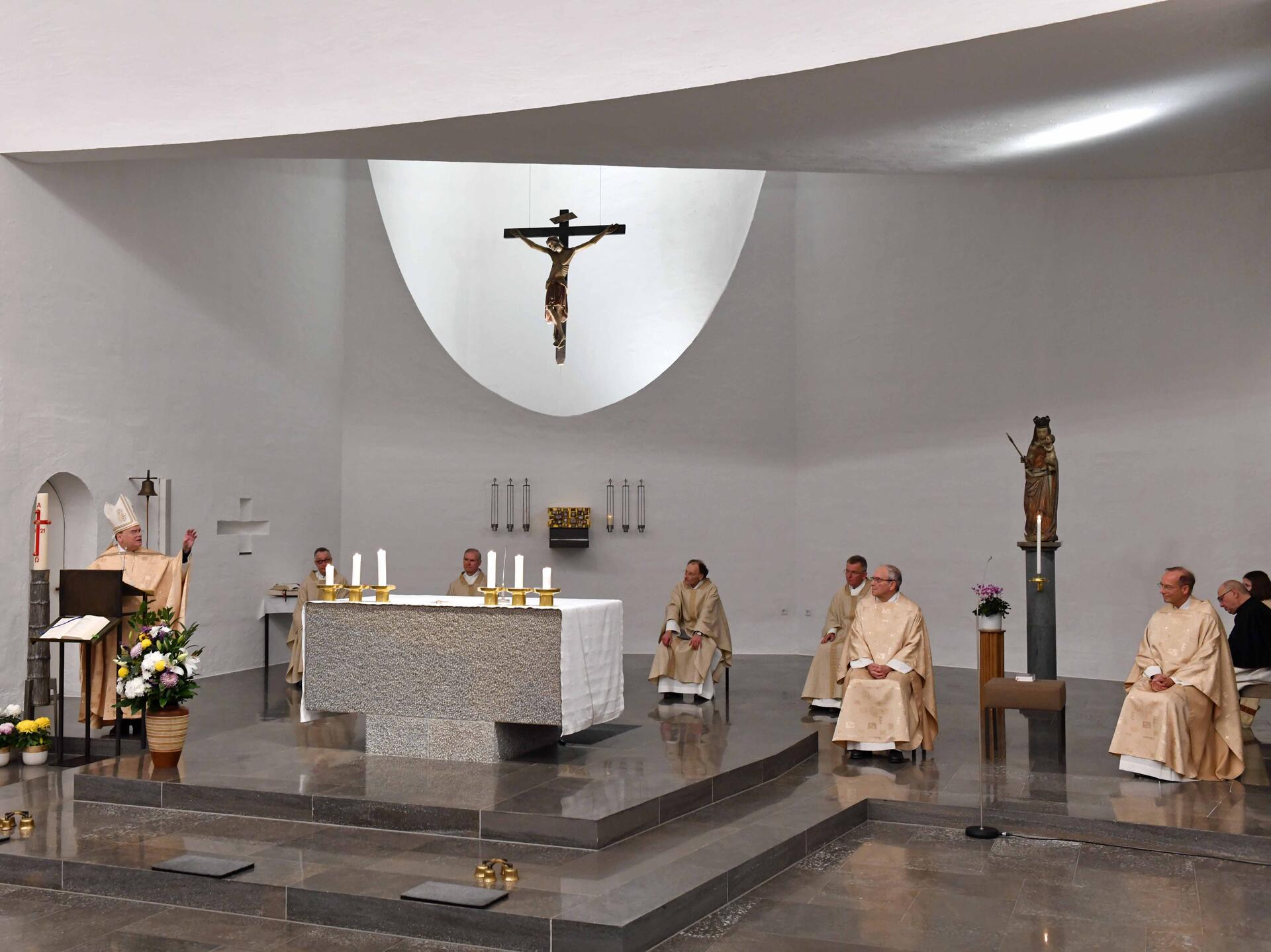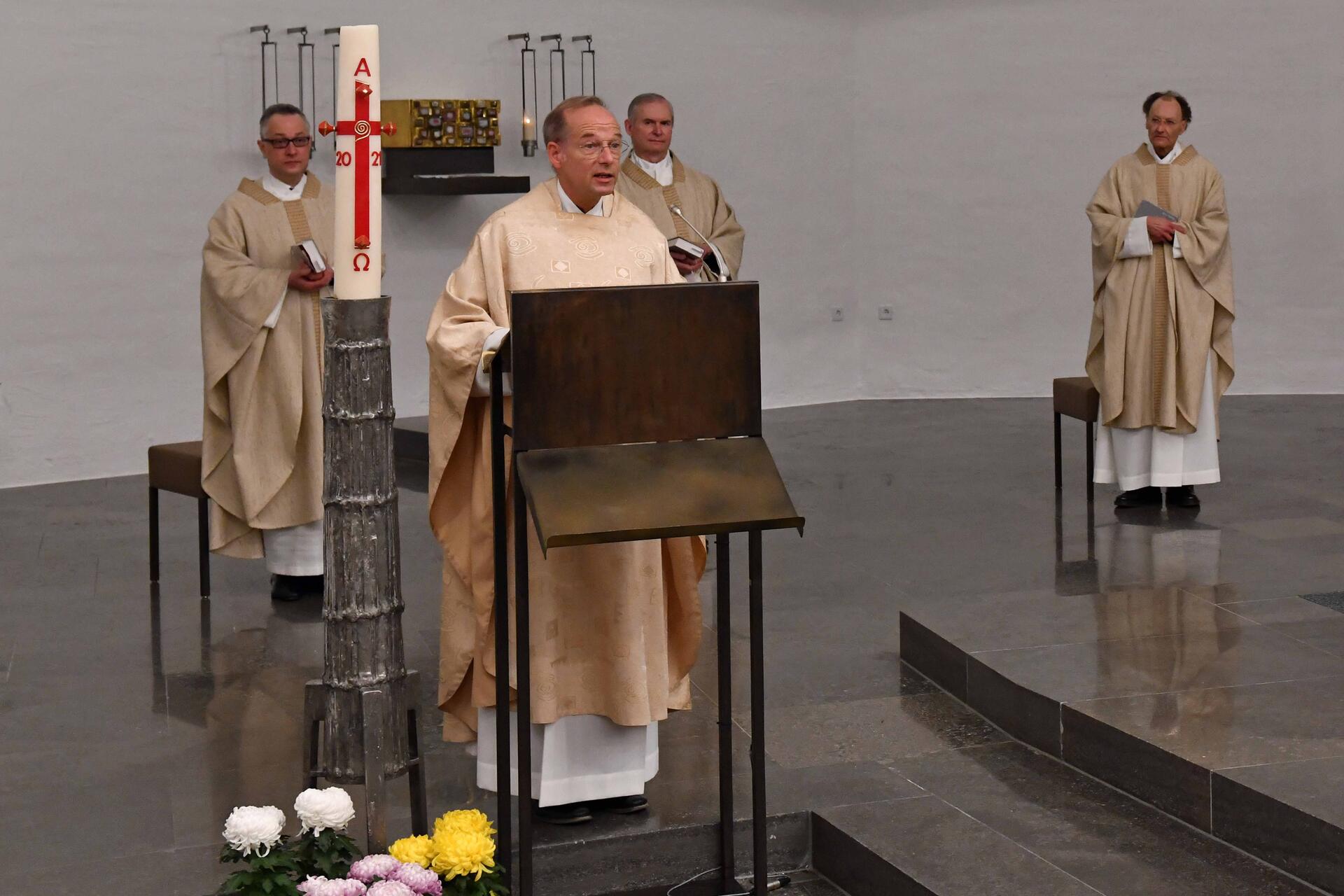 Auch deshalb habe er sich für diesen Festgottesdienst ganz bewusst für das Evangelium vom Barmherzigen Samariter entschieden. Einerseits wollte Bischof Bertram damit zum Ausdruck bringen, dass der Beauftragte für Geistliches Leben im Bistum Augsburg eine Querschnittsaufgabe innehat. Andererseits daran erinnern, „dass der Raum für Spiritualität nicht nur eine Kirche, ein Vortragssaal, ein Exerzitienhaus ist, sondern wie ein Wasserzeichen alle drei wesentlichen Grundvollzüge der Kirche durchzieht“. So wie sie der Evangelist Lukas in den drei „Weggeschichten“ vom Barmherzigen Vater (Martyrie), von den Emmaus-Jüngern (Liturgie) und eben dem Samariter (Diakonie) beschreibt.