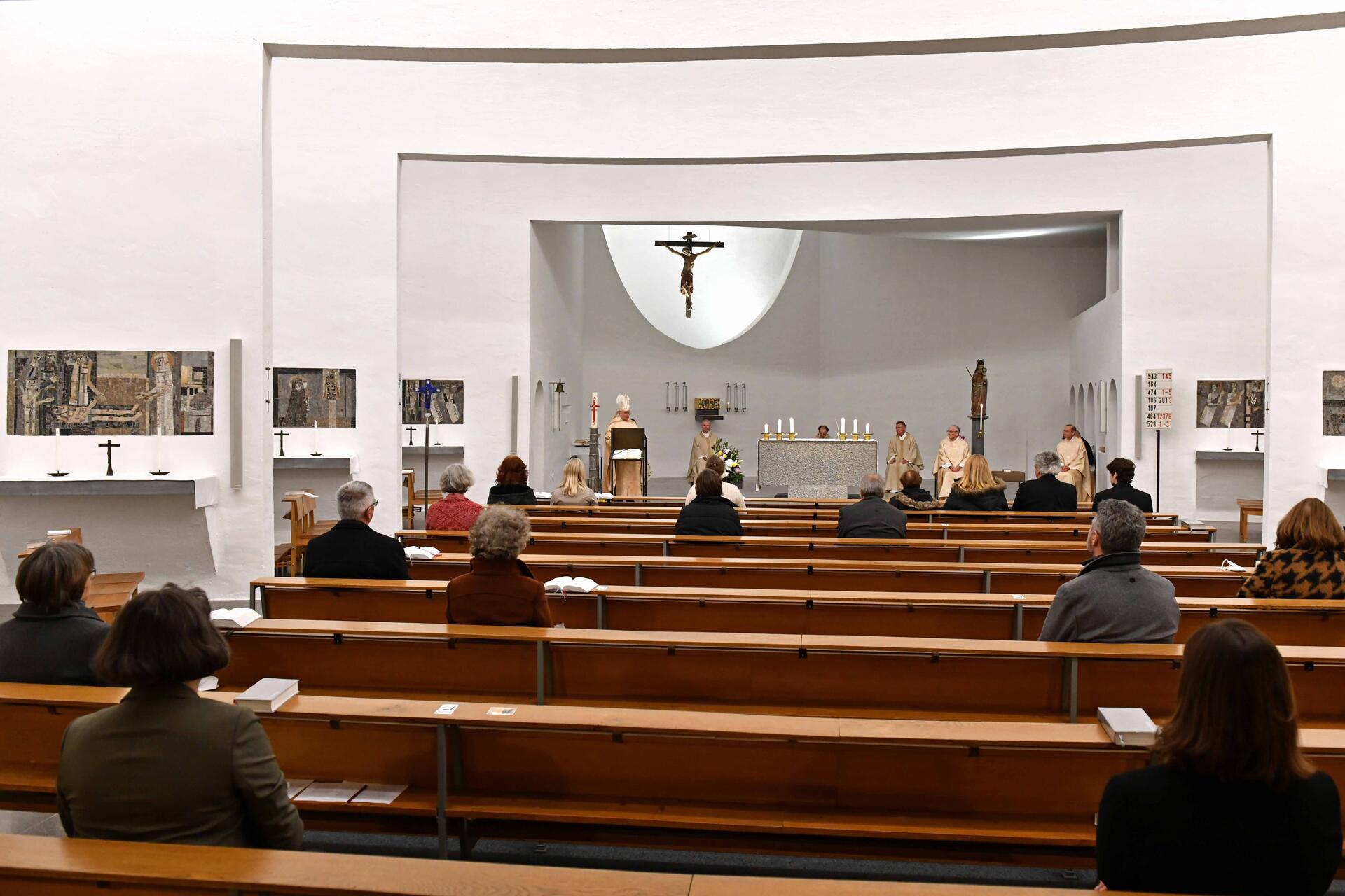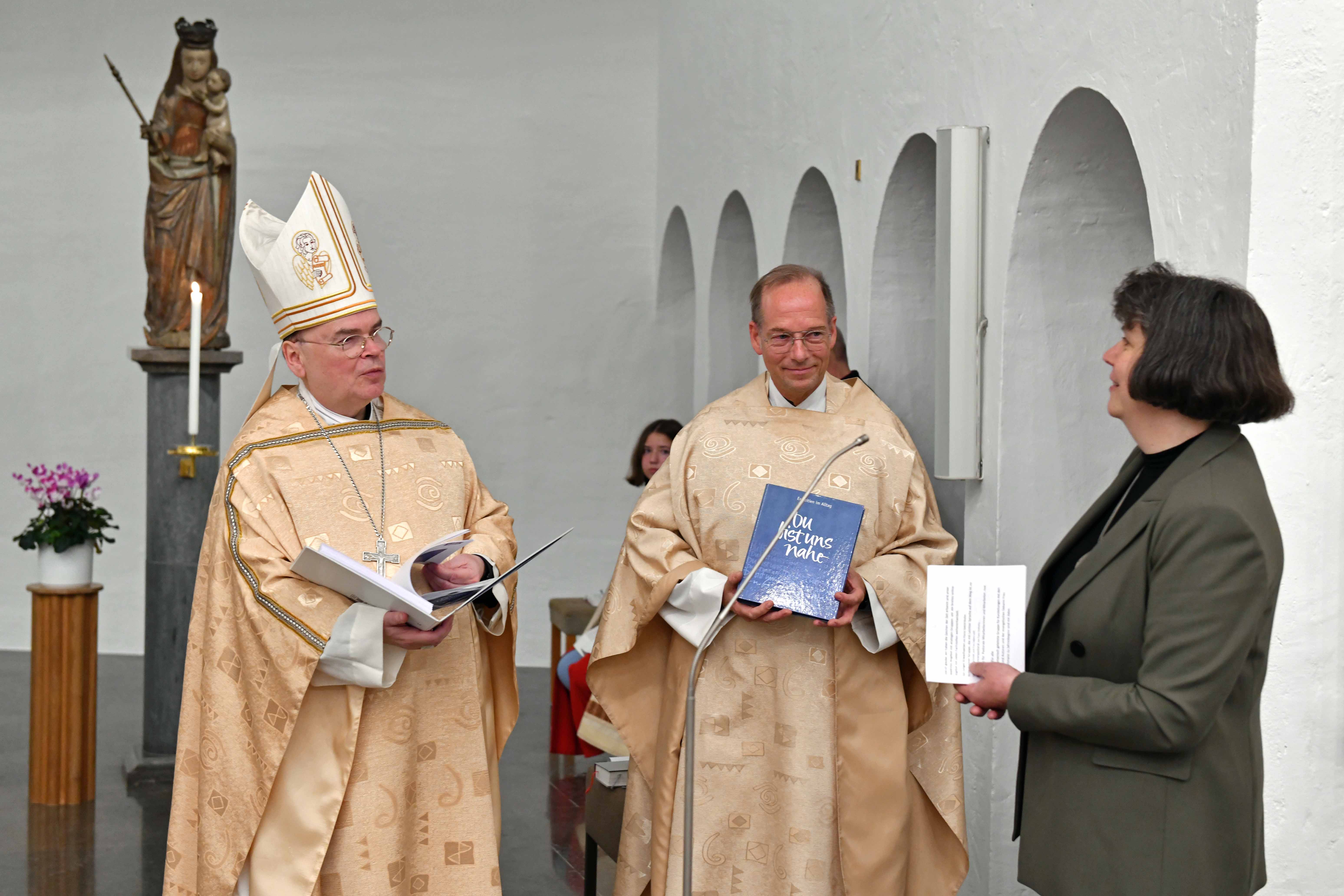 Am Ende des Gottesdienstes überreichte Gemeindereferentin Ursula Lobmaier aus dem Fachbereich Exerzitien Bischof Bertram die neue rund 100-seitige Werkmappe zu „Exerzitien im Alltag“ samt einer Ausgabe in Leichter Sprache. Sie steht unter dem Titel „Du bist uns nahe“ und ist für das ganze Kirchenjahr geeignet.