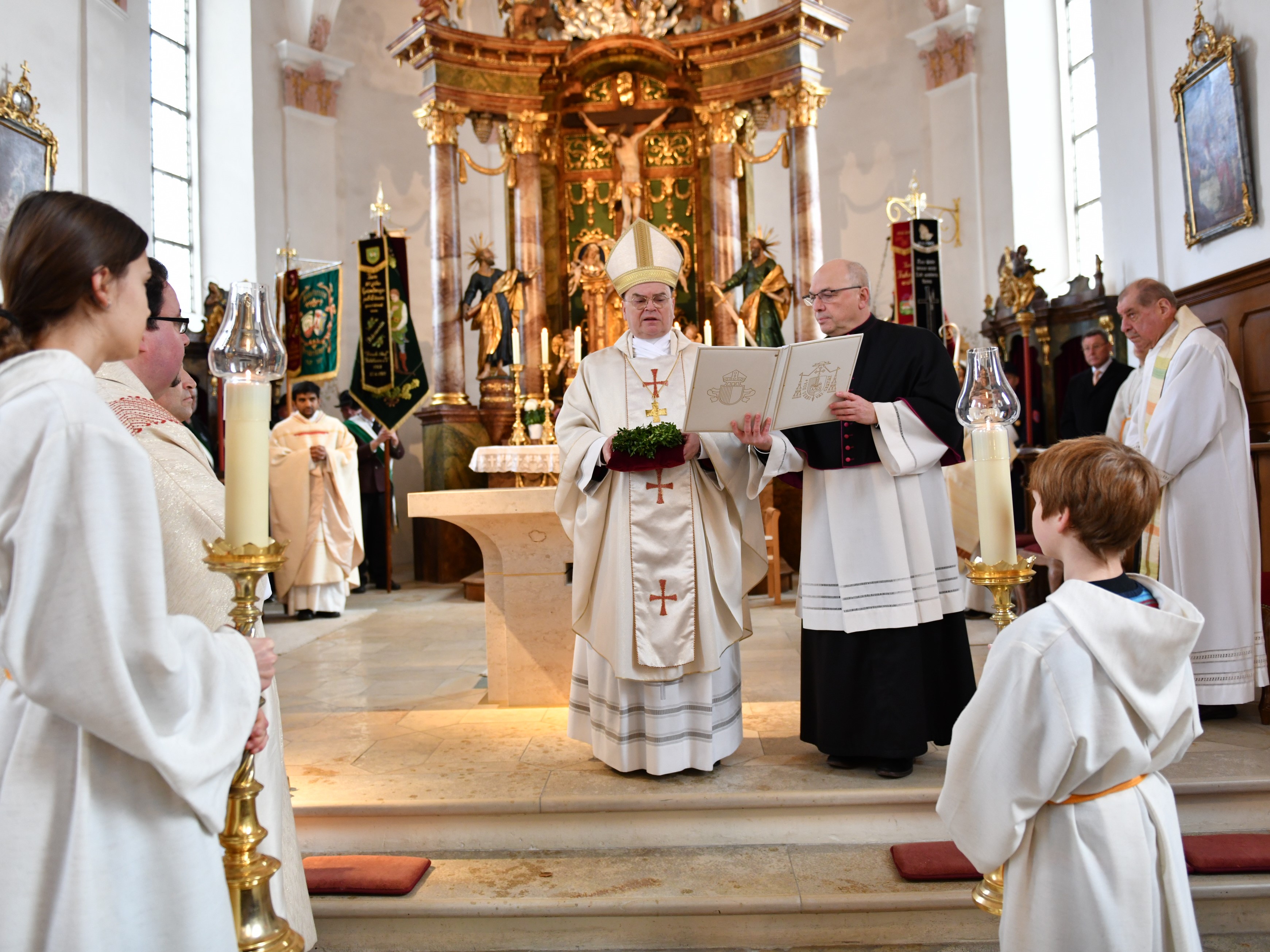 Die Pfarrei St. Peter und Paul in Genderkingen kann sich seit dem heutigen Samstag über einen neuen Altar und Ambo in ihrer Pfarrkirche freuen. Bei einem feierlichen Pontifikalgottesdienst weihte Bischof Dr. Bertram Meier das von Künstler Gerhard Nerowski gestaltete Altarensemble und erinnerte dabei an besondere Orte, die als „Tore des Himmels“ auf ein „Mehr“ hinter allem Sichtbaren verweisen.