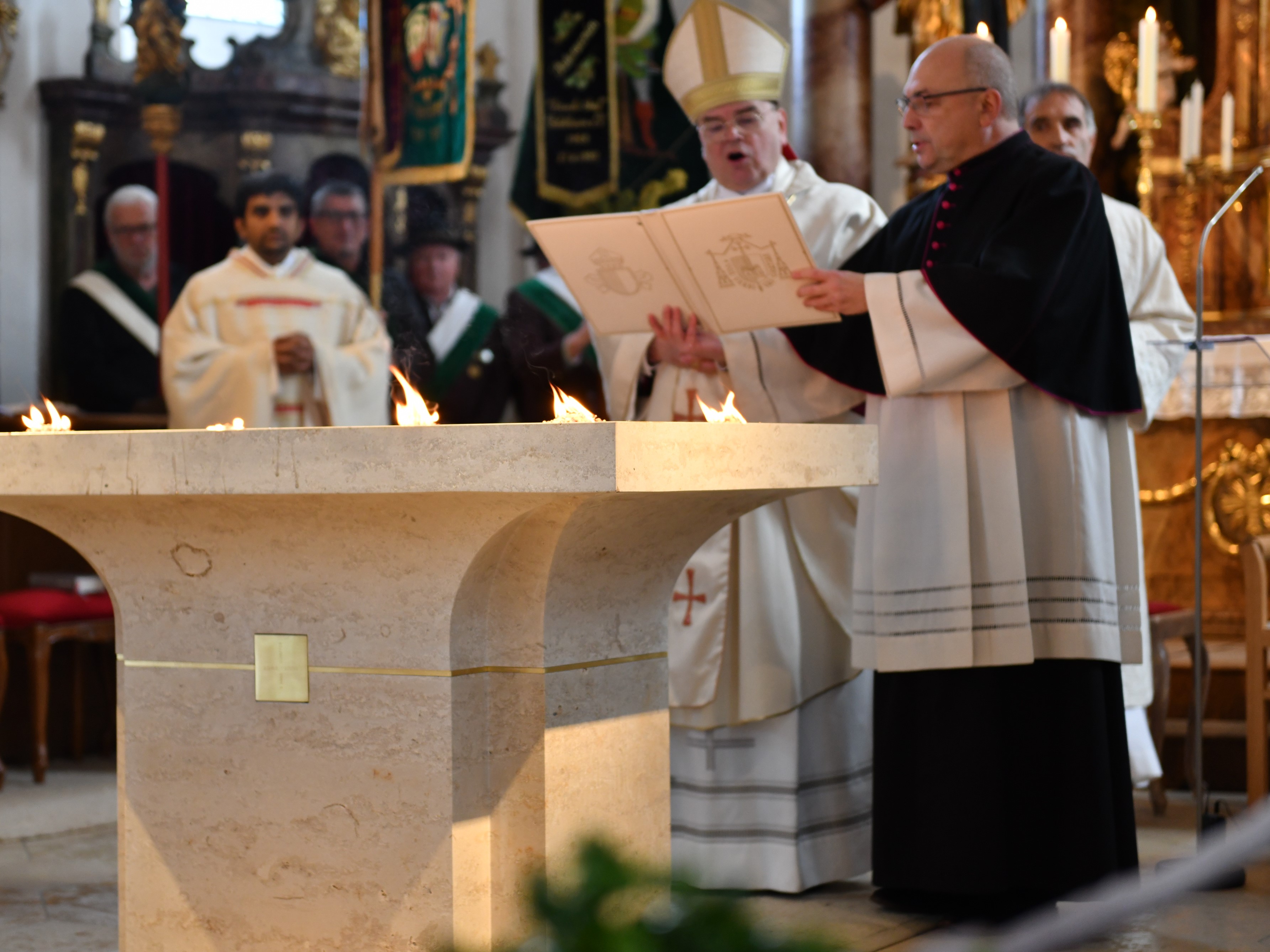 Eine Altarweihe bedeute, einen Kirchenraum bewohnbar zu machen. Dies gelinge erst, wenn man es schaffe, sich darin zu orientieren, griff Bischof Meier einen Spruch des italienischen Architekten Mario Botta auf. „Ja, auch hier ist das ‚Haus Gottes‘ und wir sind seine Gäste. Wir sind da, um uns neu zu orientieren und ihm, dem Licht unseres Lebens, der aufgehenden Morgensonne zuzuwenden“, richtete er sich schließlich mit einer Bitte an die Gläubigen: „Bewohnen Sie, liebe Genderkinger, diesen Kirchenraum? Ich wünsche es Ihnen, dass er Ihnen immer lieber wird, gerade jetzt, wenn ein neuer Altar die Bedeutung dieses Ortes hervorhebt.“ Dieser, so Bischof Meier, werde durch die Salbung herausgenommen aus dem funktionalen Alltag. „Er ist nicht mehr irgendein Steinblock in Tischform, sondern wird geweiht ausschließlich zum liturgischen Dienst, zur Feier der Eucharistie.“