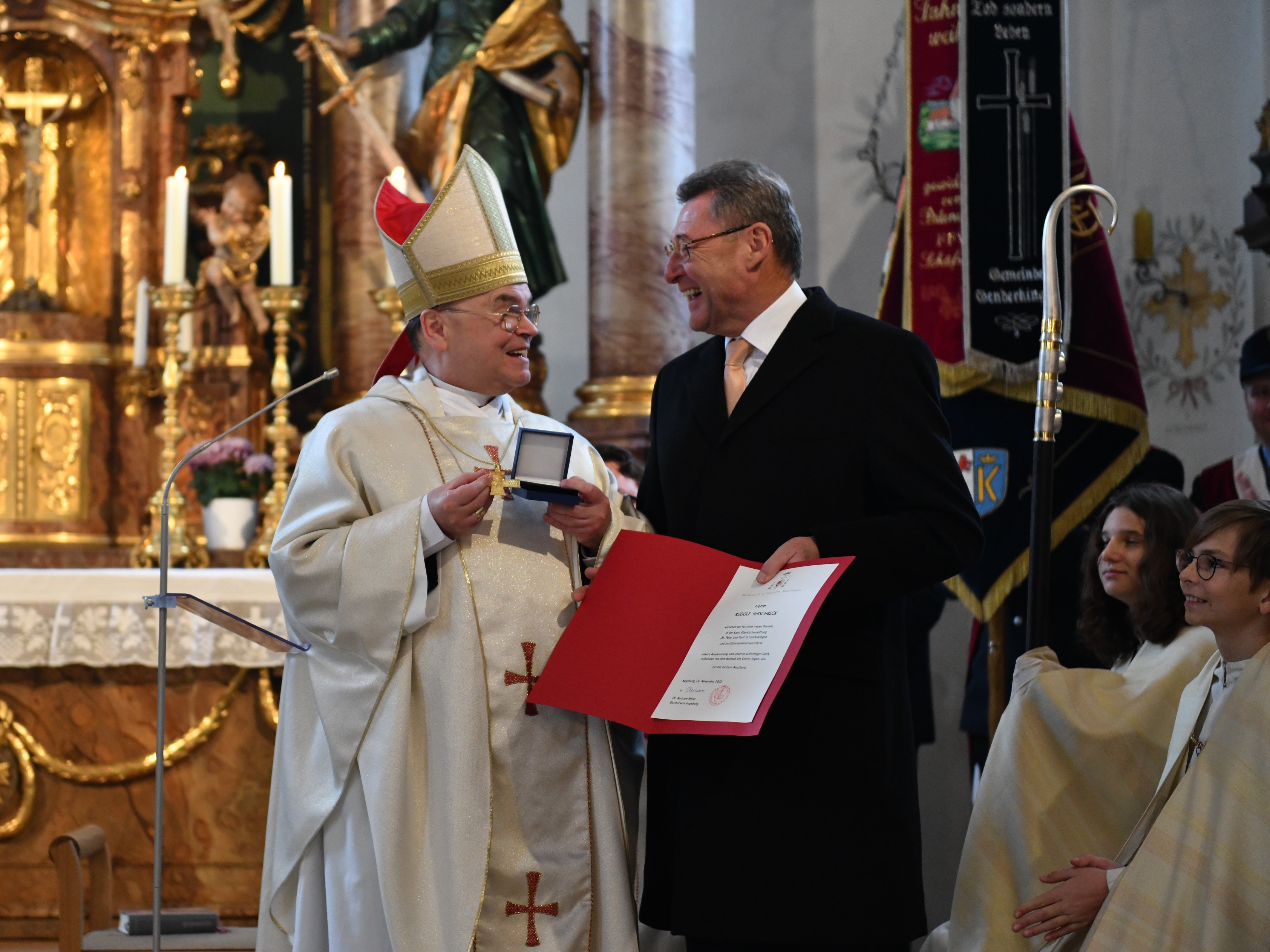 Das feierliche Pontifikalamt endete mit einer besonderen Auszeichnung: Bischof Bertram überreichte dem langjährigen Kirchenpfleger von Genderkingen sowie Mitglied im Diözesansteuerausschuss, Rudolf Hirschbeck, das silberne Ulrichskreuz. Mit diesem bedankte er sich für seine wertvollen Dienste in beiden Gremien.