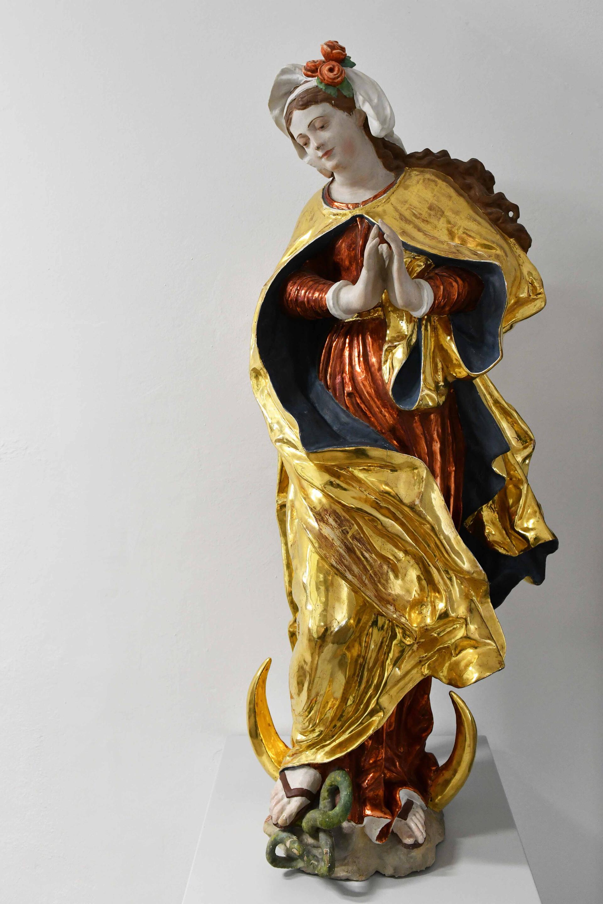 Die künstlerisch hochwertige Figur der Maria Immaculata, die auf dem linken unteren Bild zu sehen ist und am heutigen Tag auf dem Titel des Gottesdienstliedblatts, wurde wohl um 1770/80 von einem unbekannten Meister geschaffen und stand bis 1984/85 an dem in diesem Jahr ausgebrannten Haus Karolinenstr. 15 in Augsburg, als sie durch eine Gussstein-Kopie ersetzt wurde. Sie gelangte im Frühjahr 2013 in den Kunsthandel, konnte jedoch durch die altaugsburggesellschaft „gerettet“ werden und befindet sich seit 2014 im Zentralgebäude Fronhof 4 des Bischöflichen Ordinariats.
