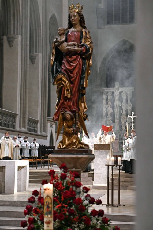 Der Bischof kam aber auch auf die Schattenseiten kirchlichen Lebens zu sprechen. „Leider haben Glieder der Kirche diesen Auftrag entweiht und ihre Berufung verspielt. Anstatt gerade Kindern und Jugendlichen zum Segen zu werden, haben sie ihnen Schaden und Leid zugefügt.“ Maria hingegen sei ohne Fehler, ohne Makel, ohne Sünde gewesen. „So ist sie ein Segen für uns und ein Modell für die Kirche.“ So gesehen, bleibe Maria unsere Mutter, unser Maßstab für unser Handeln: „Bringen wir den Menschen Gottes Segen – gerade jetzt in dieser dunklen Zeit der Krise und Pandemie“, ermutigte Bischof Bertram die Gottesdienstbesucher.