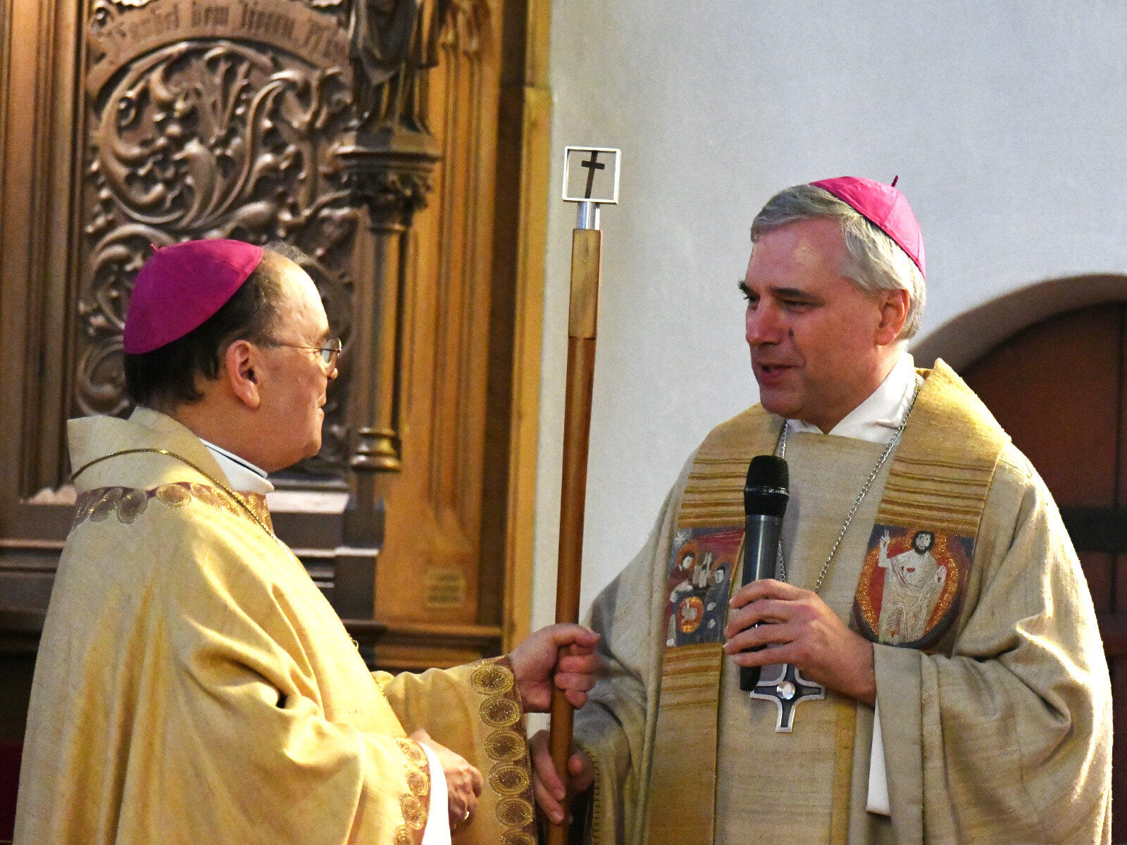 Am Ende des Festgottesdienstes überreichte Weihbischof Karrer schließlich einen eigens angefertigen Pilgerstab an Bischof Bertram. Er solle eine weitere Brücke schlagen, nämlich zwischen den beiden Bistumspatronen Martin und Ulrich, sei doch auch letzterer dafür bekannt gewesen, sein gesamtes Bistum immer wieder bewandert und bereist zu haben. Bischof Bertram freute sich über als „Zeichen meines eigenen Weges“ und versprach, gerne mit dem Pilgerstab im Bistum Augsburg unterwegs zu sein, sei es als Wanderer auf dem Martinsweg oder als Bischof in den Gemeinden seiner Diözese.