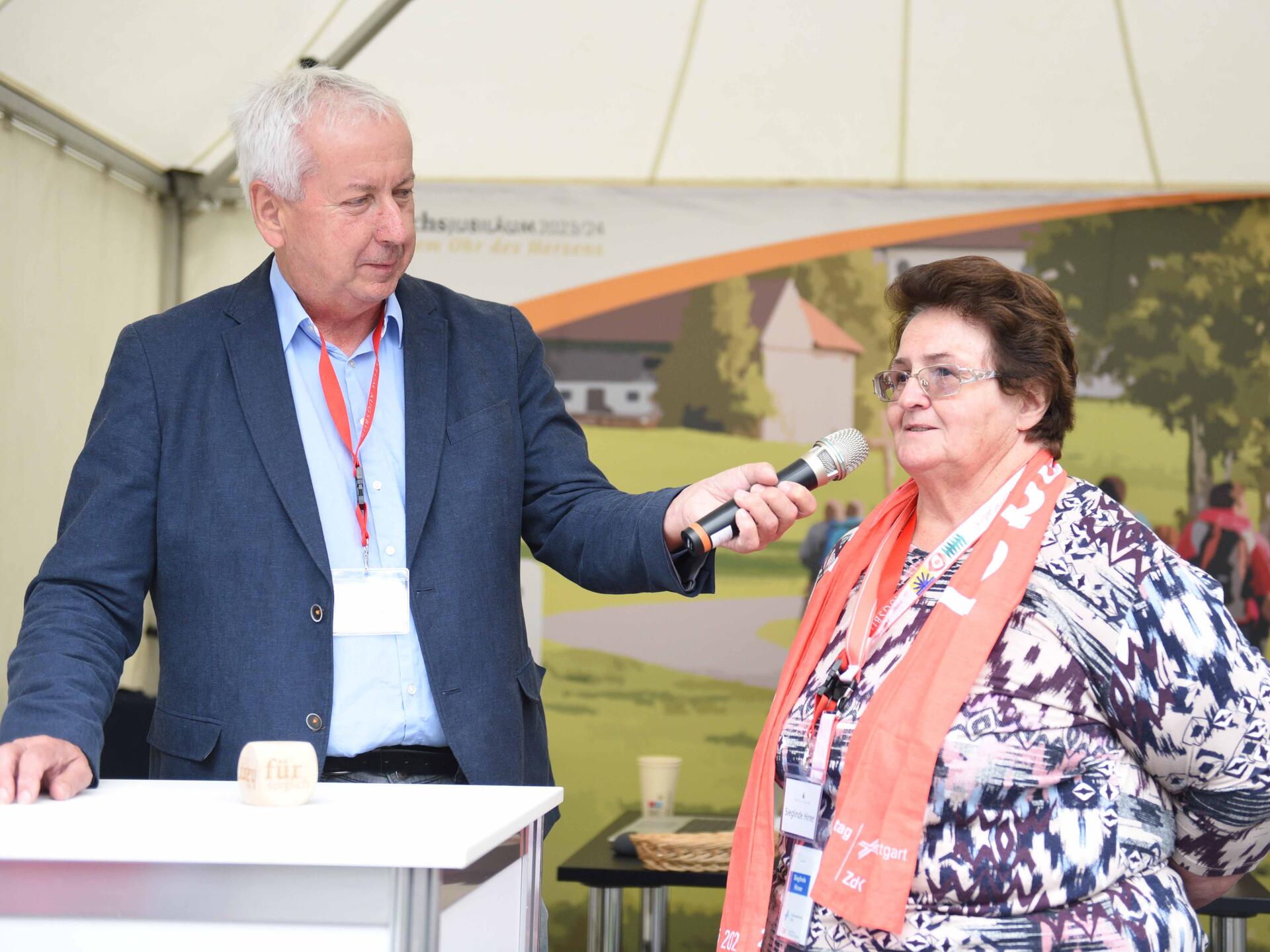Was für sie der Hl. Ulrich bedeutet? Für diese Frage musste die zweite Diözesanratsvorsitzende Sieglinde Hirner nicht lange überlegen: „Der hl. Ulrich ist ein Mensch, der sich mutig eingesetzt hat für die Menschen und für den Glauben. Er ist ein Beispiel für uns alle“, betonte sie, die mit reichem Katholikentags-Erfahrungsschatz punkten kann. Seit vielen Jahren ist sie bei den Katholikentagen vertreten und vom Stand des Bistums kaum wegzudenken. Was sie an den Tagen schätzt? „Die Vielfalt, die Begegnungen mit den Menschen, die Einblicke in ganz unterschiedliche Städte“, sagte sie. Am Stand ist Hirner nie weit weg von der Kaffee-Maschine und heißt dort alle Besucher/-innen mit einem Tässchen Kaffee herzlich willkommen.