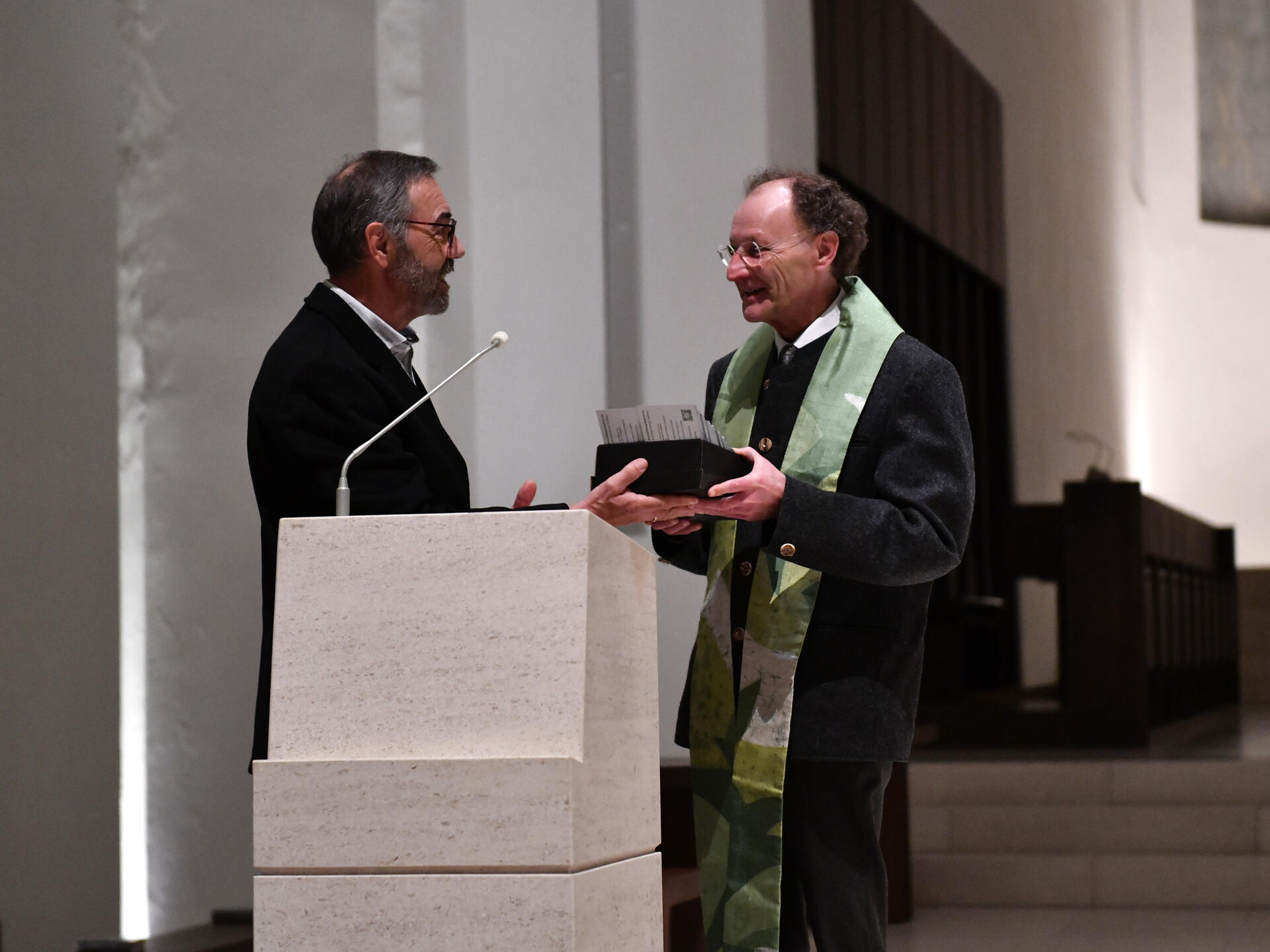 Nach einem Wechselgebet, in welchem die Vertreter des Betroffenenbeirats ihre Bitten zu Gott brachten, überreichte der Sprecher des UBBA, Friedrich Braun, dem Generalvikar einen neu erstellten Flyer. Der Handzettel, in welchem der Betroffenenbeirat sich und seine Aufgabenbereiche vorstellt, wurde in einer Auflage von 30.000 Stück produziert und wird nun in den Pfarreien des Bistums verteilt. „Möglichst viele Menschen, Gläubige und solche, die der Kirche nicht mehr nahestehen, sollen erfahren können, dass es Hilfe für Missbrauchsopfer gibt und dass wir uns Mühe geben, vergangenes Unrecht aufzuarbeiten und präventiv Kinder und Jugendliche vor Missbrauch schützen wollen“, so Braun gegenüber dem Generalvikar.