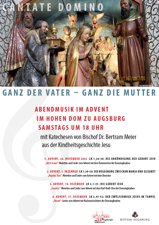 Augsburg (pba). Gesprochenes und gesungenes geistliches Wort prägen in dieser Adventszeit wieder die Konzertreihe „Cantate Domino“ im Hohen Dom zu Augsburg. Umrahmt von adventlichen Motetten und Liedern der Augsburger Dommusik hält Bischof Dr. Bertram Meier am Vorabend der vier Adventssonntage jeweils eine Katechese zur Kindheit Jesu. Zum 3. Advent geht es in der Katechese des Bischofs um die Geburt Jesu.