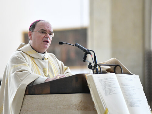 An diese fünf bewegenden Zeugnisse anschließend wollte Bischof Bertram anknüpfen und gab deshalb bewusst ohne Mitra ein kurzes „Predigt-Zeugnis“ ab, in dem er von seinen Erfahrungen als Bischof in der Pandemie erzählte und betonte, dass er trotz aller schwierigen Umstände die vergangene Zeit oft auch als „Hochzeit der Freundschaft und des Humors“ erfahren habe. „Humor ist seit jeher ein großes Thema gerade dort, wo Menschen leiden: in Krankenhäusern und Seniorenheimen, bei Todesfällen und in Zeiten politischer Unterdrückung. Der Humor hat – das hat mir Corona gezeigt – einen bevorzugten Platz in der Trauer.“ Das Lachen lösche den Kummer nicht aus, mache ihn aber erträglich, betonte der Bischof und verwies auf den berühmten jüdischen Humor, der selbst in Zeiten schrecklichster Verfolgungen und Demütigungen aufgeblüht sei. „Im Gegensatz dazu fällt mir auf, dass unsere christlichen Fanatiker manchmal so erschreckend humorlos sind … Im Namen Jesu darf man nicht lachen! Meinen sie, doch das Gegenteil ist der Fall: Humor haben heißt sich nicht so furchtbar ernst nehmen.“