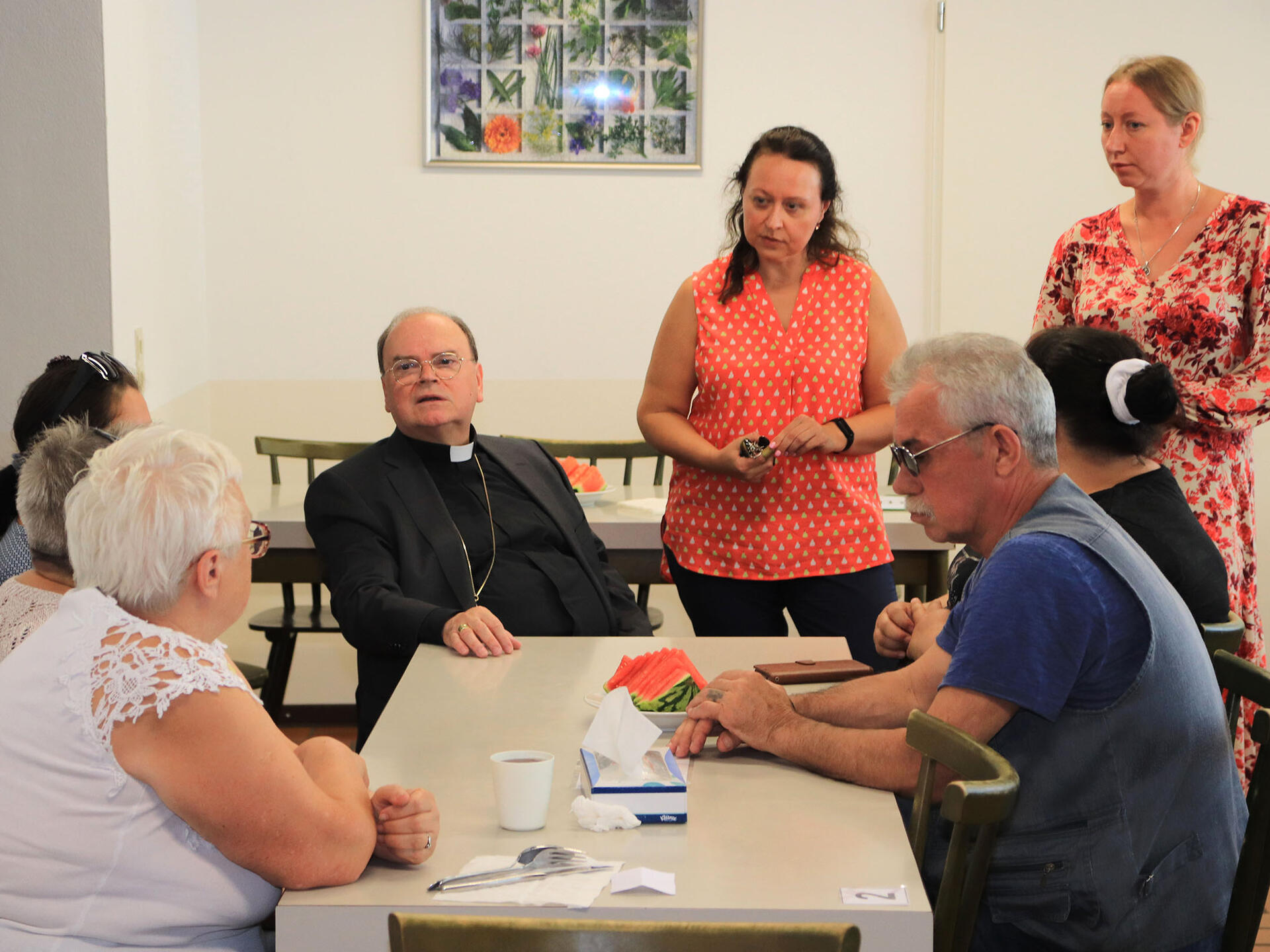 Zu Beginn des Gesprächs herrschte große Zurückhaltung bei den Flüchtlingen. Um das Eis zu brechen erzählte der Bischof von seiner Reise in die Ukraine vor erst drei Wochen. Die Flüchtlinge spürten die Wertschätzung für ihr Land und ihre Landsleute. Und so fingen sie an von sich zu reden. Mehrere Frauen betonten, wie dankbar sie seien für die freundliche Aufnahme in Deutschland durch die Menschen hier wie auch die Kirche und dafür, dass sie zu dem Caritas-Mittagstisch kommen können. „Wir sind unendlich dankbar dafür“, sagten sie. Und sie wünschten sich gleichzeitig, dass noch mehr kommen können.