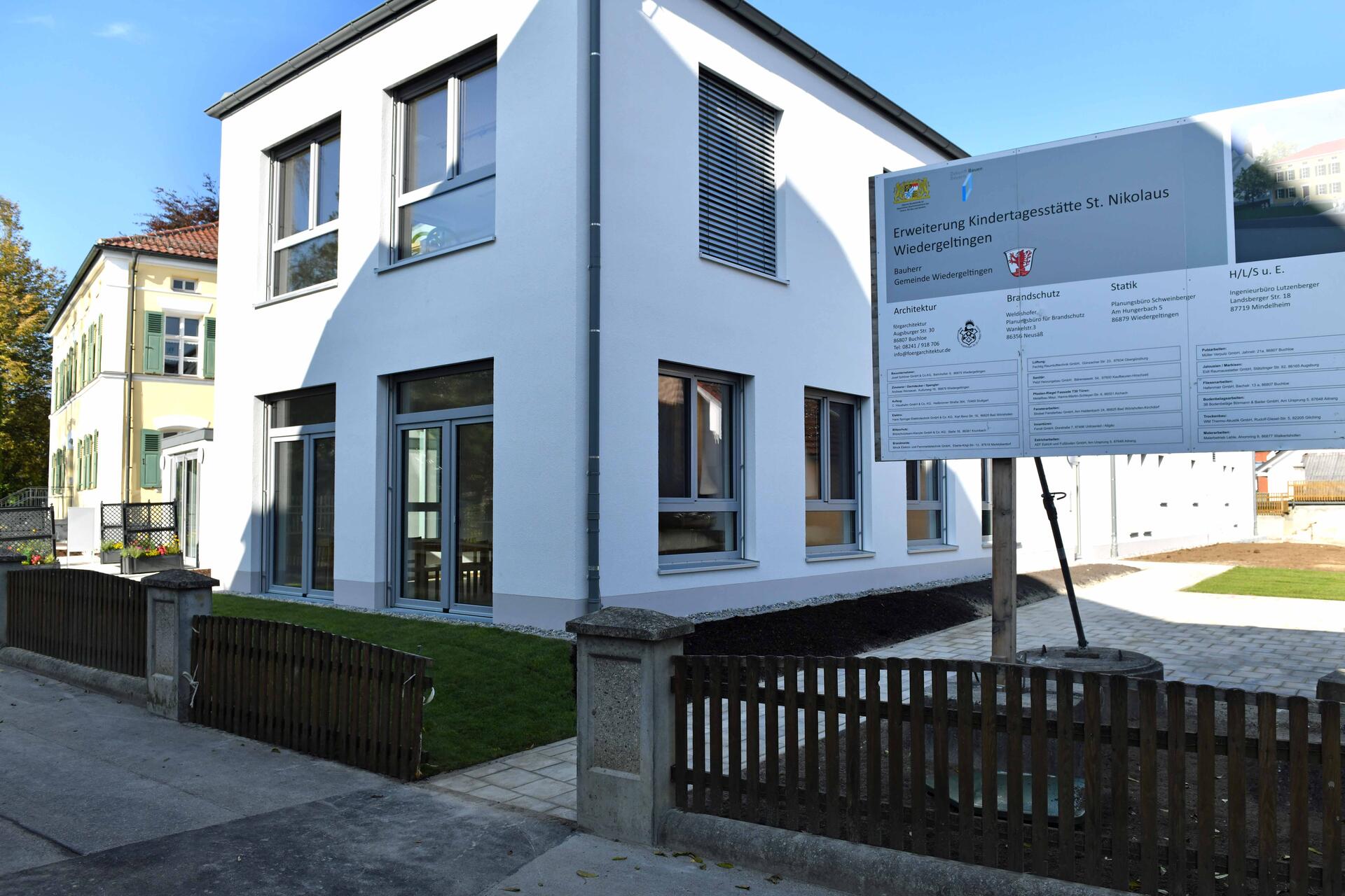 Es ist Kirchweihsonntag, 9.15 Uhr, der Himmel ist wolkenfrei: Erst die sieben Böllerschützen des örtlichen Veteranen- und Soldatenvereins vernebelten mit je drei Salutschüssen vor der Wiedergeltinger Kirche kurzzeitig die Sicht – kündigten aber zugleich Großes an. Denn sie begrüßten nicht nur die Festgäste zur Segnung des fertiggestellten Neubaus der Kindertagesstätte St. Nikolaus, sondern lieferten gleichzeitig einen Vorgeschmack auf die Geräuschkulisse, die ab dieser Woche die neuen Räumlichkeiten mit Leben füllen wird.