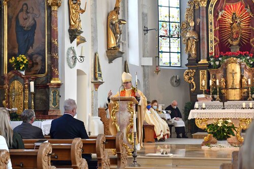 Nach knapp drei Jahren Planungs- und Bauzeit stellte Bischof Bertram in Anwesenheit der bayerischen Staatsministerin für Familie, Arbeit und Soziales Carolina Trautner sowie Vertreterinnen und Vertretern aus Kommunalpolitik, Kirche und Dorfgesellschaft das Mammutprojekt der Unterallgäuer 1.500-Seelengemeinde sowie die Erzieherinnen und Kinder unter den Segen Gottes. So stand am heutigen Kirchweihfest für den Bischof nicht nur das prachtvoll ausgeschmückte Kirchengebäude im Mittelpunkt, sondern auch der Kitaneubau um die Ecke.