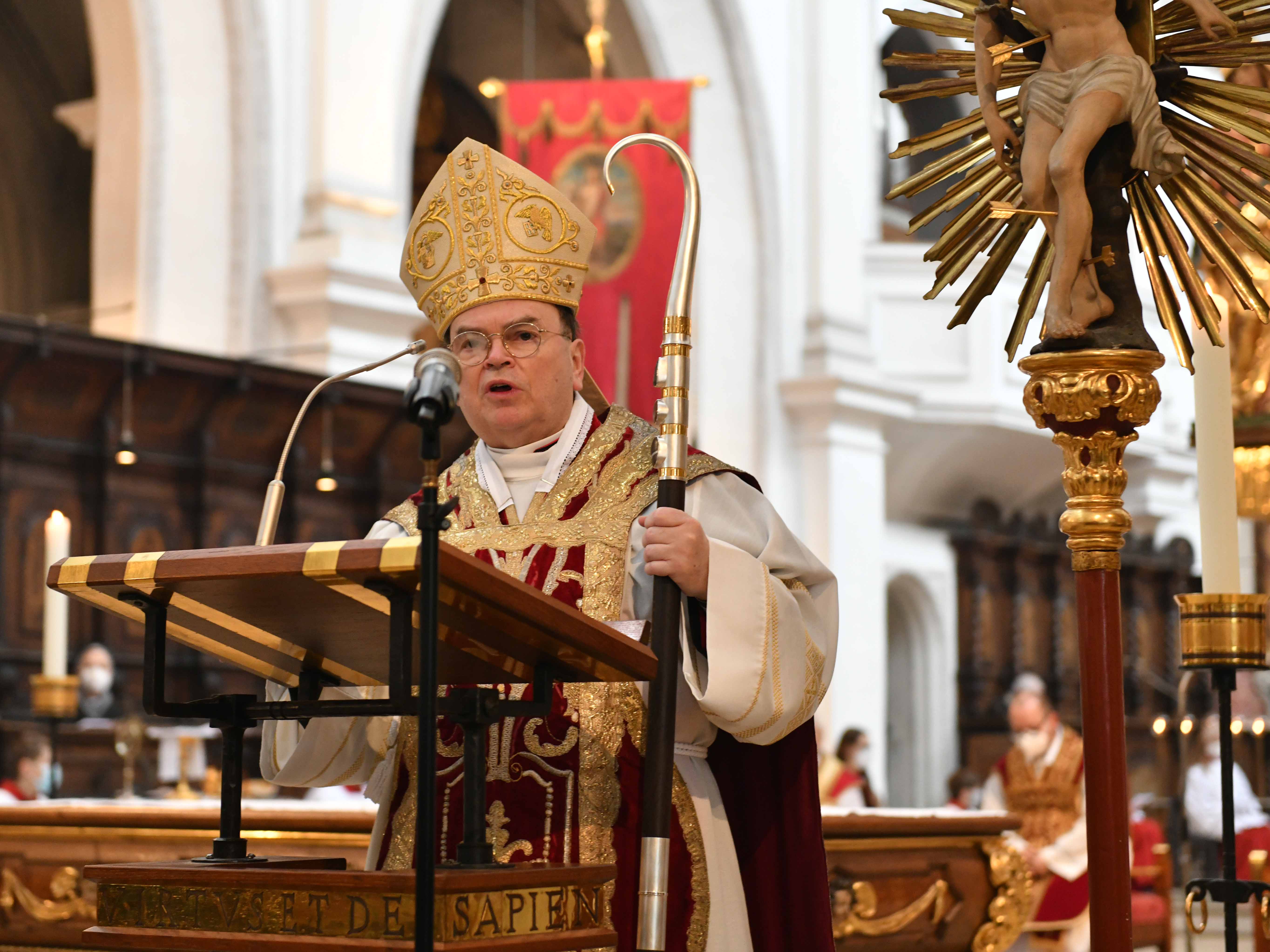 Jesus habe seinen Jüngern ein dreifaches „Fürchtet Euch nicht“ zugerufen, betonte der Bischof in seiner Predigt und deutete dies als Ermutigung für uns Christen im Heute. „Vermitteln wir nicht oft den Eindruck: Wir Christen fürchten uns? Wir meiden das Statement, das Bekenntnis mit Konsequenz.“ Doch gerade jetzt seien überzeugte und überzeugende Christen gefragt. „Wir sind weder Opium für ein aufgewühltes Volk noch Beruhigungsmittel für aufgescheuchte Seelen.“ Vielmehr gehe es darum unsere Zeitgenossen in heilsame Unruhe zu versetzen. „Klare Kante braucht die Kirche. Sie hat nicht den Auftrag Schalmeienklänge universaler Harmonie zu predigen, sondern Ernst und Freude am Evangelium.“