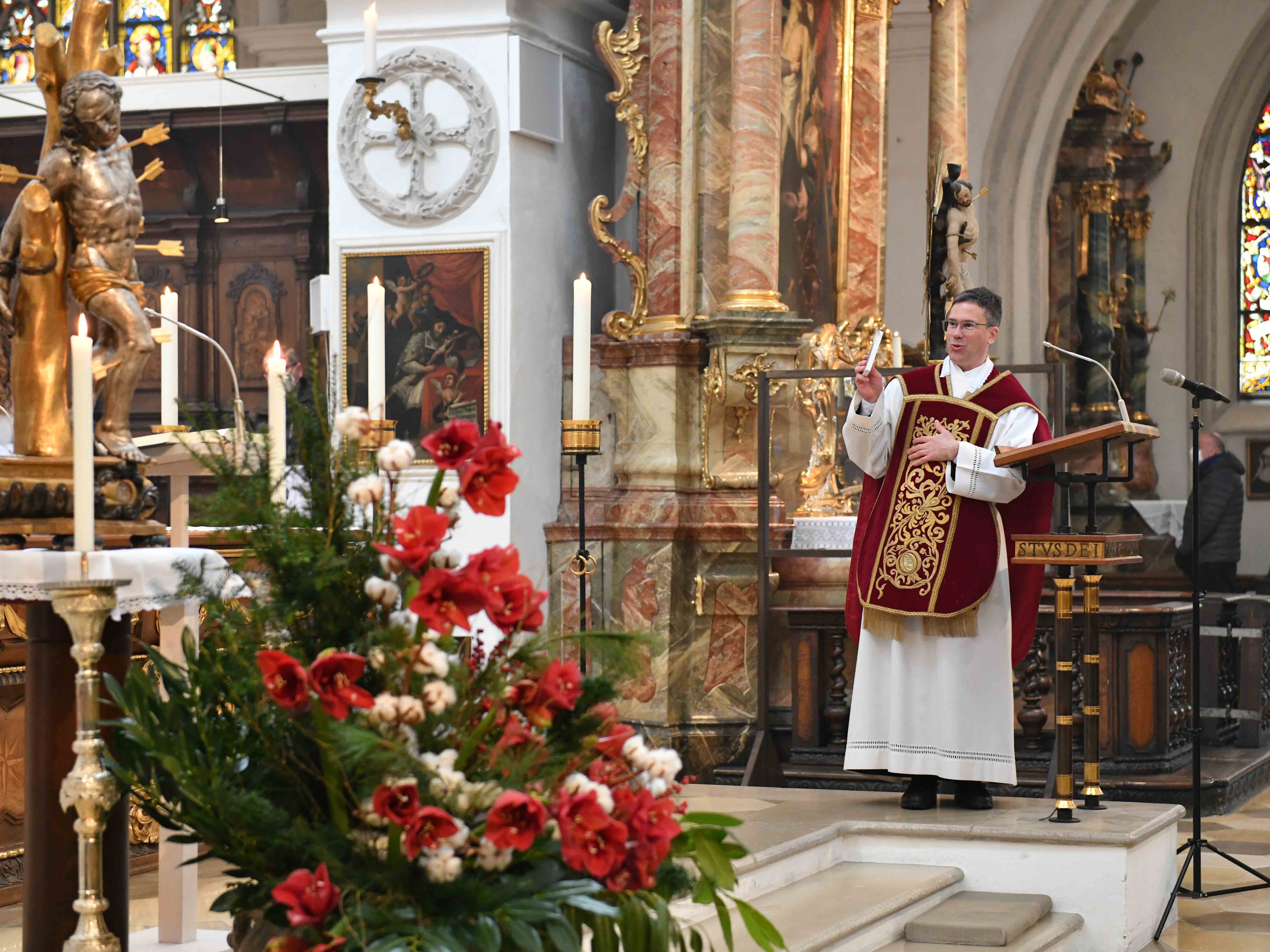 Angesichts der Corona-Pandemie sei vielen Menschen die Angst auf die Pelle gerückt. „Die Pest von damals heißt heute Corona“, betonte Bischof Bertram. Der hl. Sebastian sei an dieser Stelle nicht nur als Pestpatron in der gegenwärtigen Pandemiezeit hochaktuell, sondern auch als Glaubenszeuge und Märtyrer. Corona lasse uns Christen in den Spiegel der Wahrheit schauen. Die Kirche(n) selbst würden in Frage gestellt: „Wozu braucht man uns? Welche Rollen haben wir in der multireligiösen Gesellschaft, die auch in Landsberg Einzug gehalten hat? Sind wir mit unserer Botschaft und den Angeboten, die wir den Menschen machen, systemrelevant?“, richtete er sich fragend an die Gläubigen und schob eine klare Antwort sogleich nach. Denn für ihn sei die Kirche in den zahlreichen sozial-caritativen Einrichtungen systemrelevant und in vielem, was den Bürgerinnen und Bürgern geboten werde, lebens- und sogar überlebensrelevant. „Mehr noch: Wir sind existenzrelevant“, betonte der Bischof. Die Kirche mache ein Angebot, das über das Irdische hinausreicht: „Wir Christen halten den Himmel offen. Wenn wir von der Erde reden, eine menschlichere Welt gestalten wollen, dann treibt uns der Glaube, dass der Himmel offensteht.“
