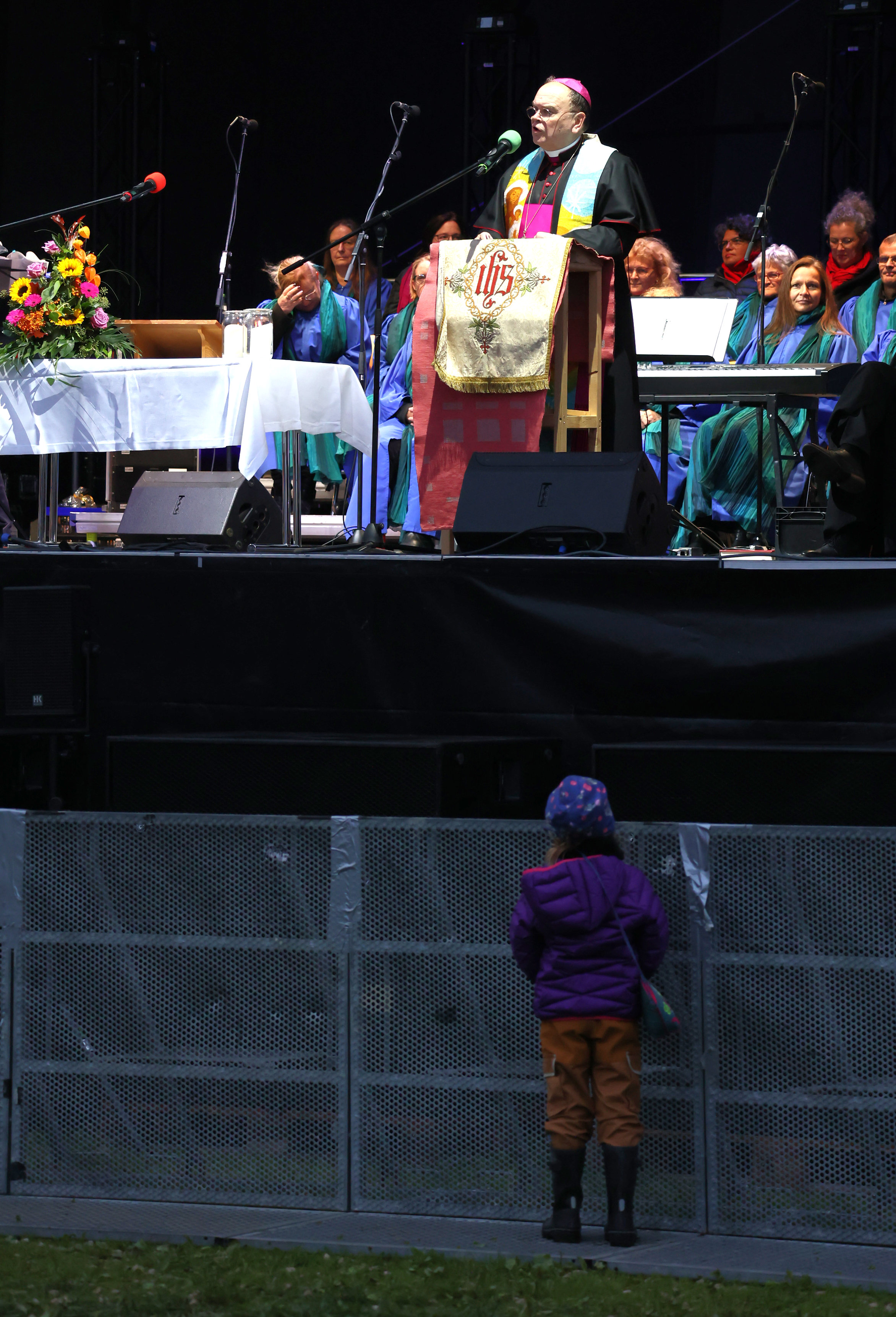 Bischof Bertram betonte in seiner teils frei gehaltenen Predigt, dass es paradoxerweise gerade die Vergänglichkeit des menschlichen Lebens sei, die die Unwiederholbarkeit, Einzigartigkeit und Kostbarkeit dieses Lebens hervorhebe: „Jeder Augenblick, den wir bewusst leben, vor allem, wenn wir ihn in Gemeinschaft erleben dürfen wie jetzt, erhält Kontur und wird zu einer Lebensspur in unserem Herzen.“ Damit meine er gerade auch Gottesdienste so wie den, den er in ökumenischer Verbundenheit am Badanger feiern dürfe. Dabei zitierte er den von den Nationalsozialisten ermordeten Jesuitenpater Alfred Delp, der aus dem Gefängnis heraus schrieb: „Das eine ist mir so klar und spürbar wie selten: Die Welt ist Gottes so voll. Aus allen Poren der Dinge quillt er gleichsam uns entgegen. Wir aber sind oft blind.“