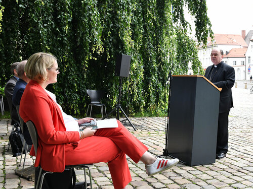 Fast täglich komme er an der Glasarche vorbei, und beinahe jedes Mal sehe er „Menschen sinnend daran vorübergehen oder still davor verharren“, so der Bischof in seiner Ansprache zur Matinee. Die Kombination aus dem Naturwerkstoff Eichenholz und dem unter hohen Temperaturen herzustellenden Kulturprodukt Glas deute auf die ambivalente Rolle des Menschen hin: „Teil der Natur zu sein und ihr zugleich entwachsen.“ Die Glasarche könne dabei Anregungen liefern zu Gedanken darüber, wie diese Doppelrolle überbrückt werden könne, sagte er und zitierte Adalbert Stifter. „Wir wollen das sanfte Gesetz zu erblicken suchen, wodurch das menschliche Geschlecht geleitet wird.“ Als Christ deute er dies als das sanfte Gesetz des Heiligen Geistes: „füreinander immer, miteinander immer öfter, nebeneinander immer seltener und gegeneinander nie mehr.“