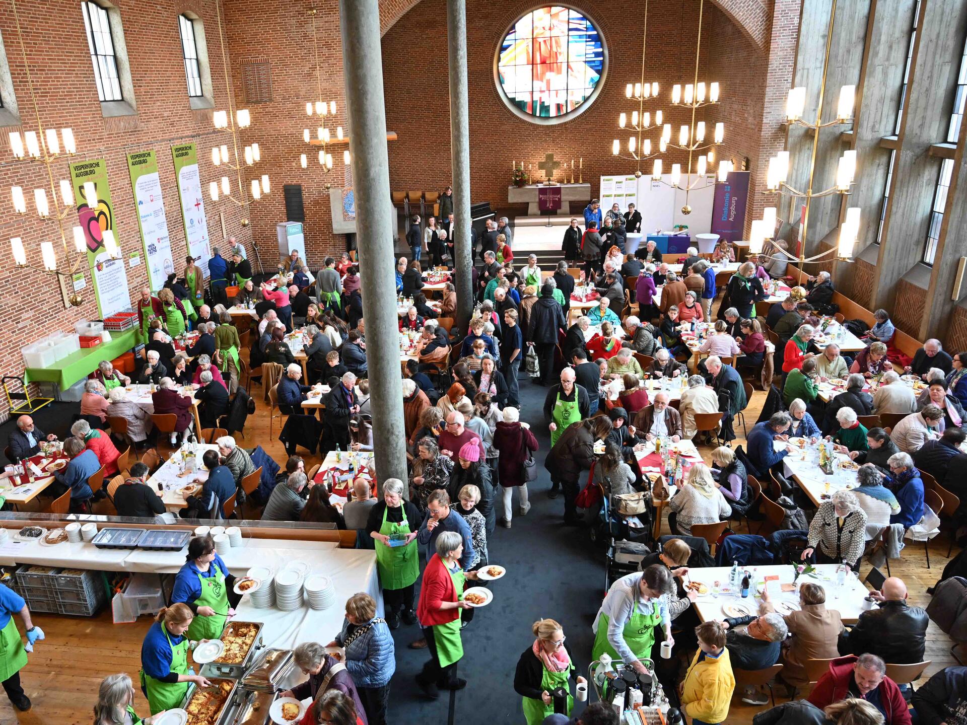 Als wichtigen Beitrag für das Zusammenleben der Stadt würdigte Oberbürgermeisterin Eva Weber das ökumenische Projekt: „Menschen an einen Tisch zu bringen, um Essen zu teilen, ist das beste Mittel um auch den Frieden zu teilen. Mein Dank gilt allen, die hier ehrenamtlich tätig sind“, so Weber. Das Motto der Aktion wurde auch im Gottesdienst und seiner Gestaltung sichtbar: So vertonte der Gebärdenchor Augsburg die Gesangstexte stimmungsvoll vor dem Altar. Zudem wurde die Feier in Gebärdensprache übersetzt.