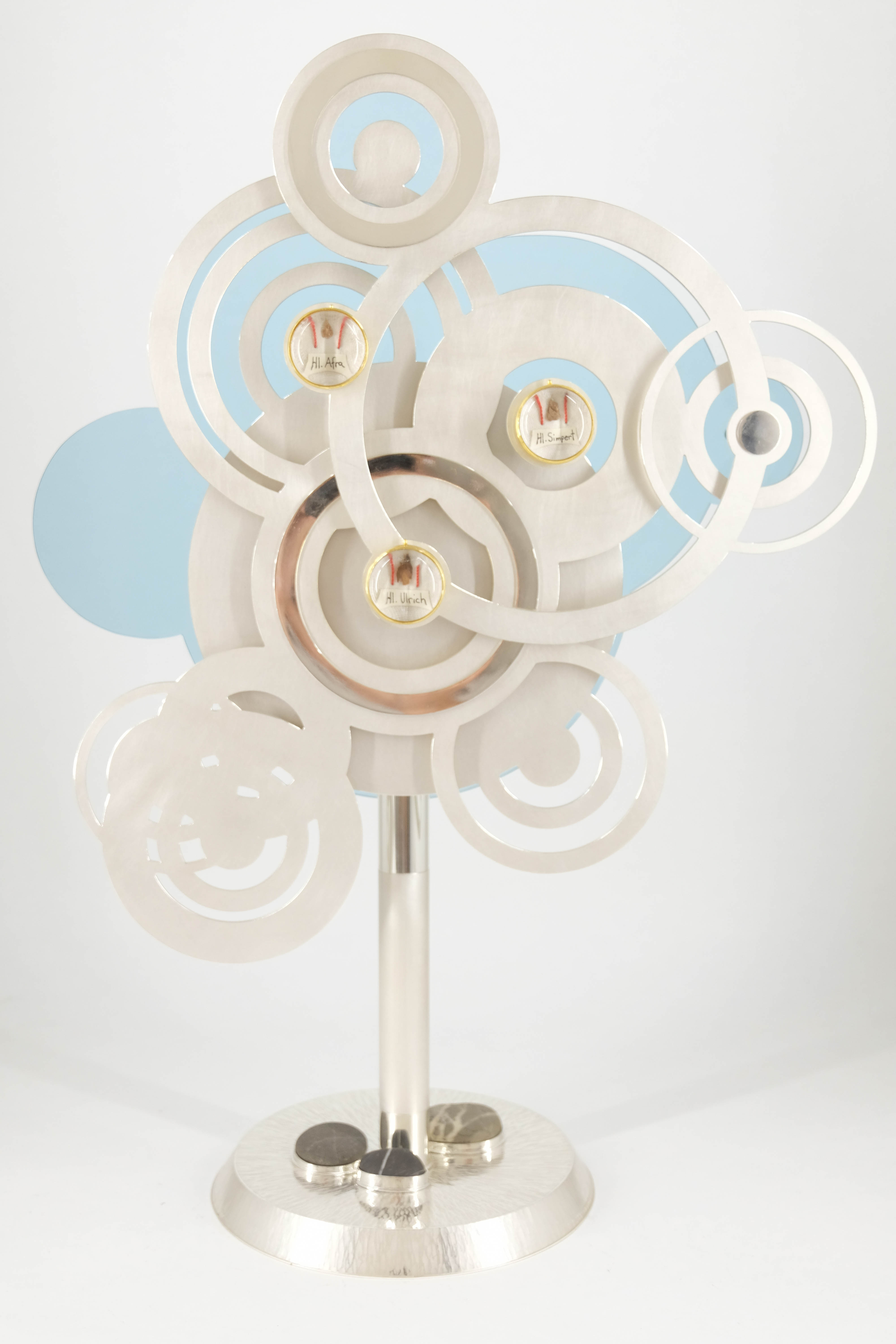 Das Ungewöhnliche an dem Kunstwerk ist, dass es Reliquien aller drei Bistumspatrone enthält. Bei der Gestaltung ließ sich der Künstler von dem Bild inspirieren, das entsteht, wenn Steine ins Wasser geworfen werden und Kreise ziehen - denn jeder der drei Bistumspatrone hat zu seiner Zeit segensreich für die Kirche von Augsburg gewirkt, so dass ihr Glaubenszeugnis bis heute Kreise zieht.