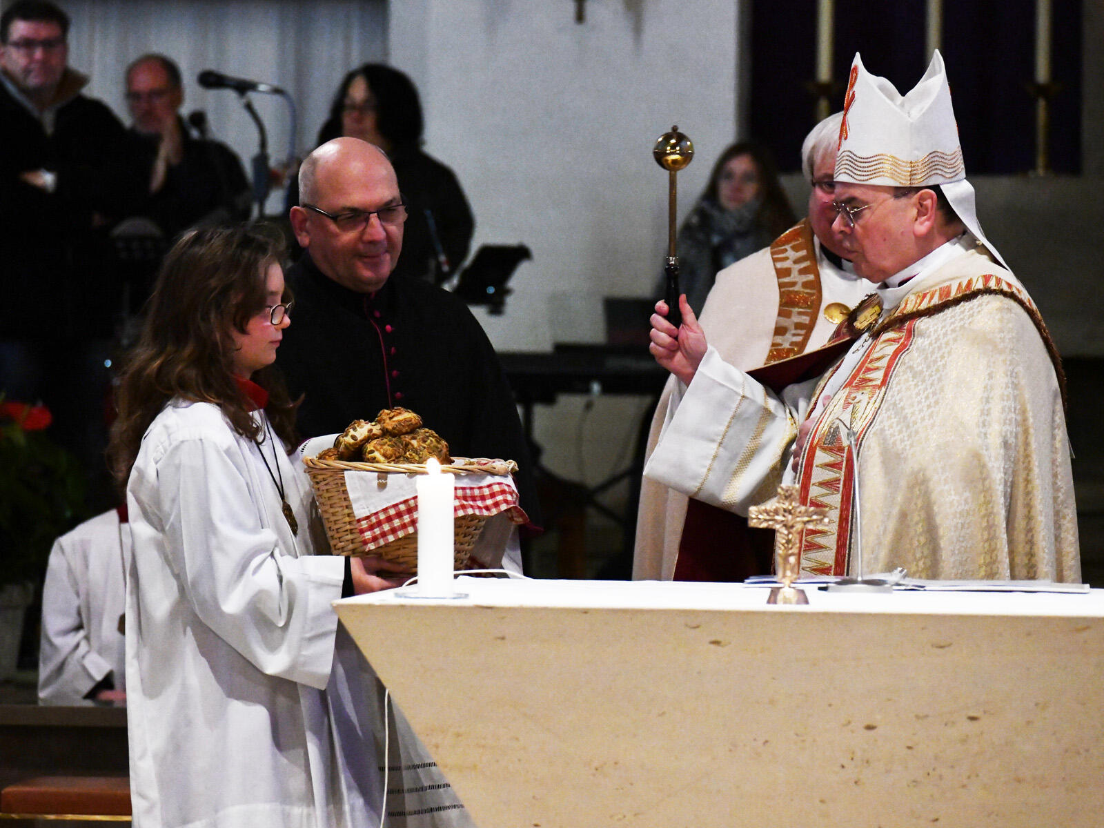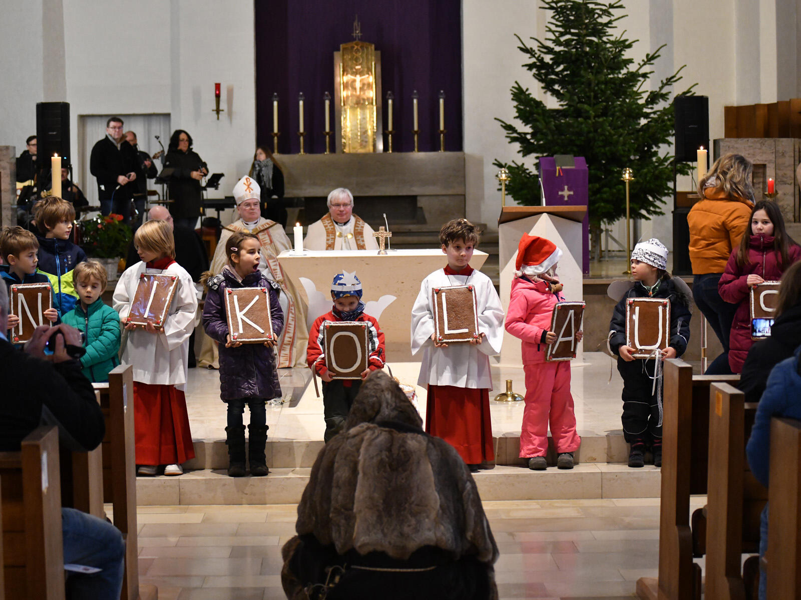 Ausgehend vom Evangelium der Aussendung der 72 Jünger (Lk 10,1-9) betonte Bischof Bertram in seiner frei formulierten Predigt, dass Nikolausdarsteller eine wichtige Funktion übernehmen würden. Er selbst habe als Kind aber vor allem Angst vor dem Krampus gehabt, bis ihm erklärt worden sei, was es mit dieser Figur in Wahrheit auf sich hat. Ausgehend von den Kostümen der Darsteller kam er auch mit den Kindern über die Unterschiede zwischen Nikolaus, Weihnachtsmann, Krampus und Engel ins Gespräch. Am Ende segneten Bischof und Pfarrer in Erinnerung an das Kornwunder gemeinsam die Nikolausbrote, die sie dann an die Mitfeiernden verteilten.