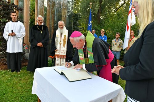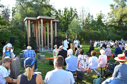 Rund 200 Gläubige haben sich an diesem Sonntagabend zum Eröffnungsgottesdienst der Ökumenischen Schöpfungszeit zwischen Fahrradweg und Flurstücken, Baumgruppen und Baggersee versammelt. Die Feier an einer der sieben Weg-Kapellen der Denzel-Stiftung in Gundelfingen-Peterswörth (Dekanat Dillingen) stand heuer unter dem Motto: „Damit Ströme lebendigen Wassers fließen“. Sie wurde geleitet vom rumänisch-orthodoxen Erzbischof Dr. Serafim Joantă, dem evangelischen Regionalbischof Axel Piper und Weihbischof Dr. Dr. Anton Losinger, der Bischof Bertram vertrat. Er wurde kurzfristig gebeten, als Repräsentant der Deutschen Bischofskonferenz auf einem G20-Treffen in Bologna teilzunehmen.