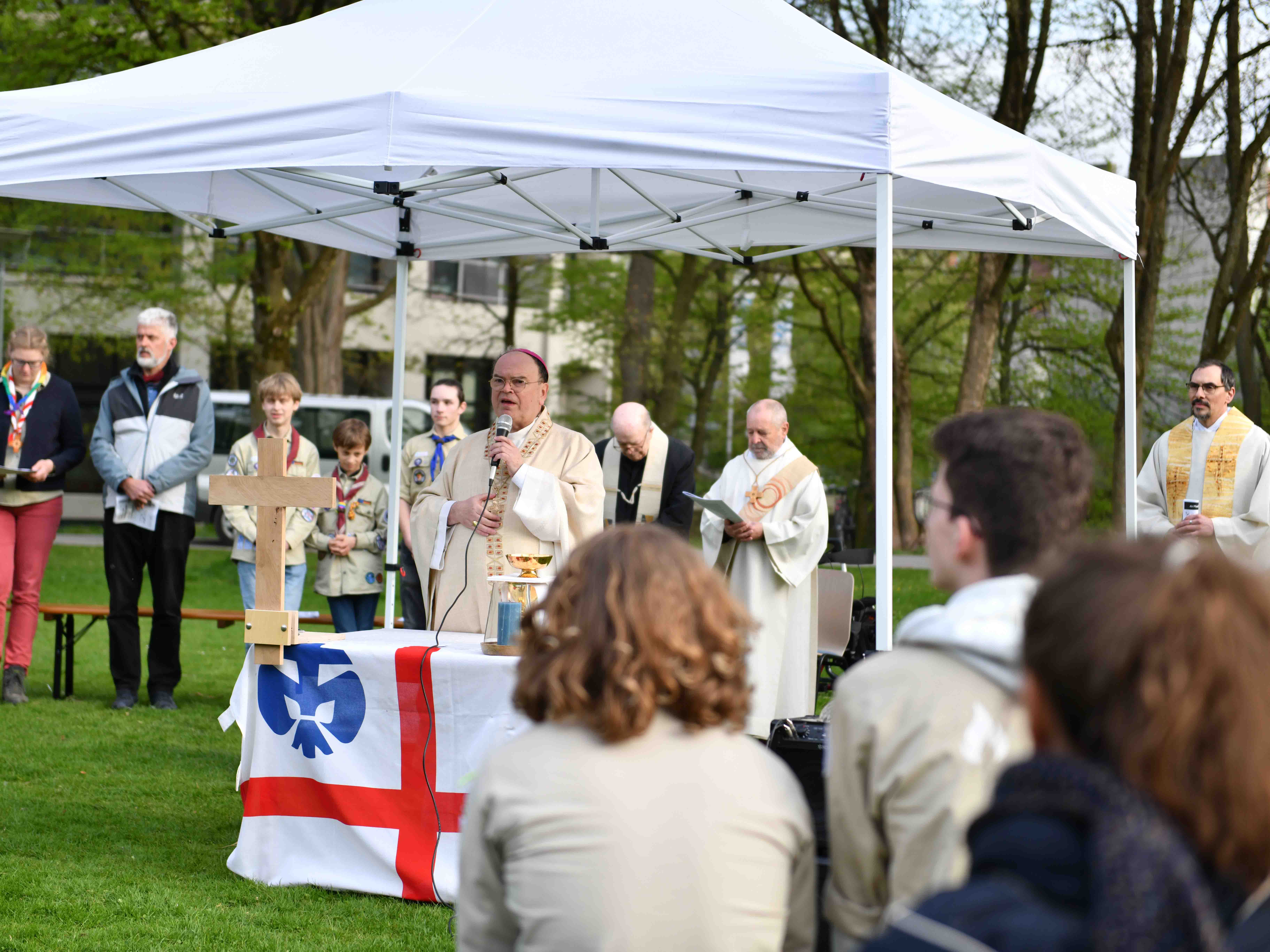 „Ihr bringt das Feuer des Evangeliums unter die Menschen“, wandte sich der Bischof in seiner Predigt an die rund 500 Kinder, Jugendliche und erwachsenen Mitglieder des Verbands, die den Weg in den Wittelsbacher Park am Augsburger Kongresszentrum gefunden hatten. Mit zwei Bildern, die er passgenau auf das Tun und Wirken der Engagierten abgestimmt hatte, erinnerte er nicht nur an seine eigene Karriere als Pfadfinder, sondern beschrieb auch zwei Kernelemente des Verbands: das „Lagerfeuer“ sowie den „Hike“, die Wanderung. So verglich er die Kirche mit einem Lagerfeuer, wenn Menschen sich um das Feuer versammelten, wenn „es flackert, wärmt“ und etwas in Brand setze. „Das Feuer zieht Kreise, es ist die Mitte“, betonte Bischof Bertram. „Ihr Pfadfinder seid keine Feuerwehr, die mit Löschfahrzeugen unterwegs ist, sondern ihr bringt das Feuer des Evangeliums unter die Menschen“, rief er den Engagierten dankend entgegen. Zu den Merkmalen des Verbandes gehöre darüber hinaus das gemeinsame Wandern und miteinander auf dem Weg sein. Hinsichtlich der Tour, auf der sich die Kirche in Deutschland mit dem synodalen Weg gerade befinde, richtete er sich mit einer Bitte an die Verbandler/-innen: „Ich wünsche mir, dass wir miteinander als Pfadfinder auf dem Weg bleiben, dass wir gemeinsam Pfade finden und gemeinsam zum Ziel kommen.“