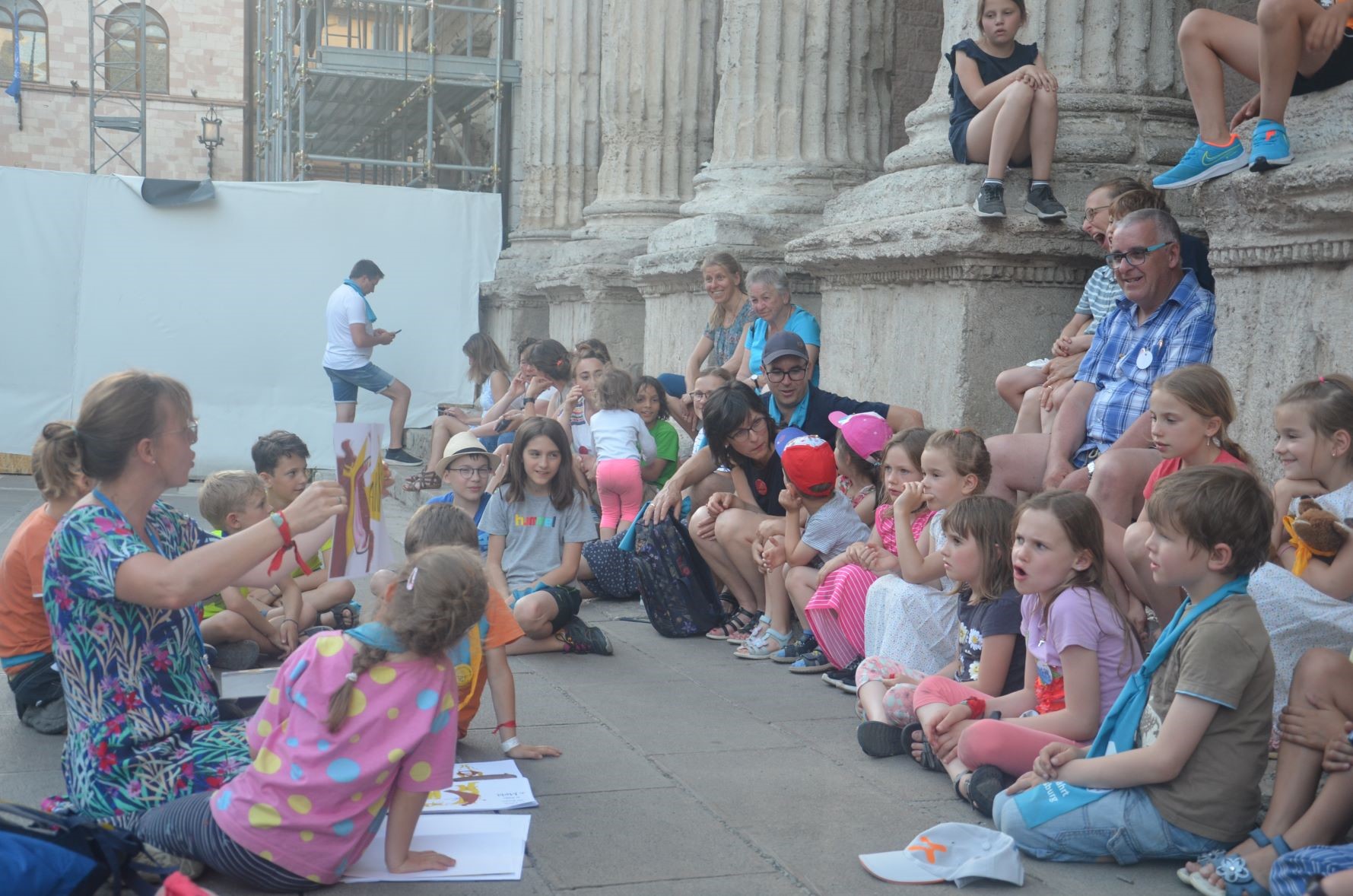 Genau das taten zur gleichen Zeit auch viele Mädchen und Buben als jüngste Pilger der Diözese Augsburg: Sie nahmen mit ihren ebenso neugierigen Eltern gerne den steilen Anstieg zum Stadtplatz von Assisi in Kauf, um dort auf den Stufen des einstigen Minervatempels, heute eine Marienkirche, die spannende Gute-Nacht-Geschichte von der kleinen Maus zu hören. Klein, aber oho!