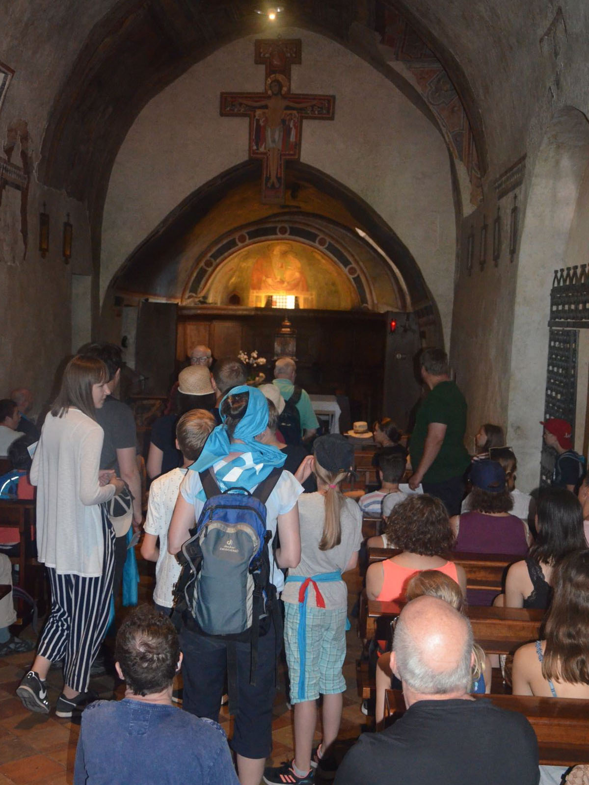Ein wahres kulturelles Highlight war am Nachmittag der Besuch in der Basilika Santa Maria degli Angeli, einer der größten Basiliken der Welt (116 Meter lang und bis zu 65 Meter breit). Etwa drei Kilometer von Assisi entfernt befindet sich hier ein Kirchlein in der Kirche: die Portiuncula, eine der Kapellen, die Franziskus, dem Ruf Gottes folgend, zunächst wortwörtlich wiederaufbaute. Die Steine sind noch die ursprünglichen; im Inneren des Kirchleins schmücken teils uralte Bilder das Leben des Heiligen aus. Auch die kleine Hütte, wo Franziskus 1226 starb, ist heute in der riesigen Basilika aufgestellt.