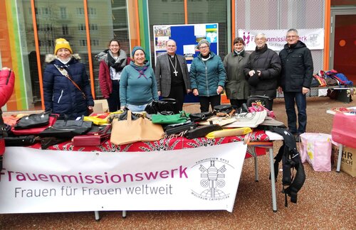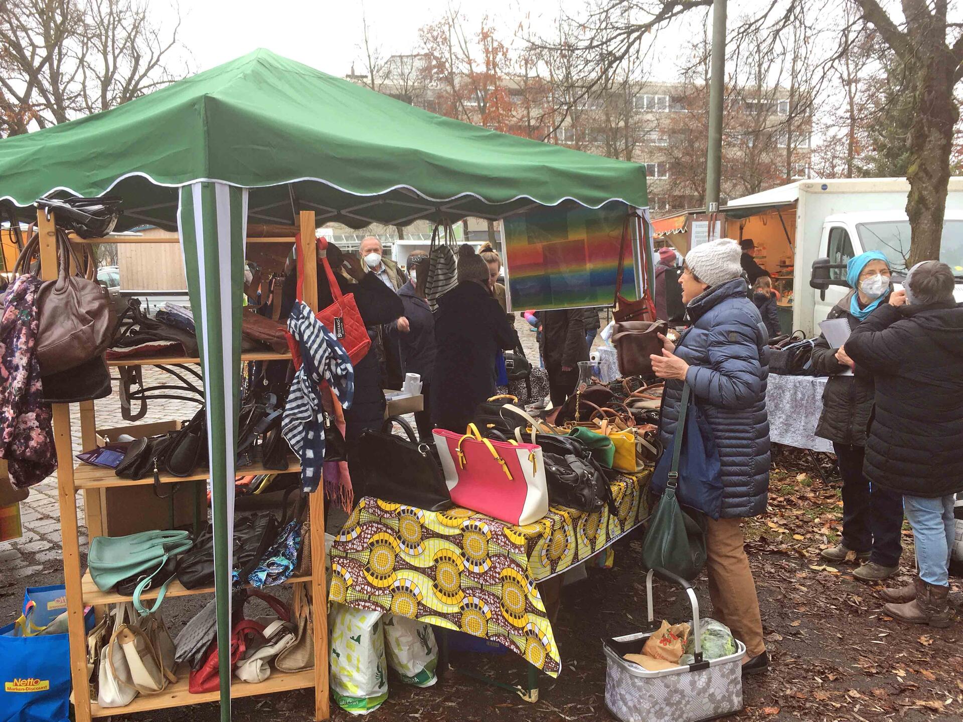 Es war ein farbenfrohes Bild, das sich am vergangenen Samstag auf dem Ernst-Reuter-Platz vor der Stadtbücherei der Stadt Augsburg und auf dem Bauernmarkt in Buchloe bot. Auf drei Tischen und auf dem Boden daneben lagen bunte Taschen, Rucksäcke und modische Schals. Ein Glitzern und Funkeln ging von einem weiteren Tisch aus, auf dem Ehrenamtliche edle Schmuckstücke schön dekoriert hatten. Mit seinem Kommen unterstrich auch Bischof Dr. Bertram Meier seine Unterstützung für die Gruppe von Frauen, die zusammen mit dem Frauenmissionswerk in Deutschland und der Abteilung Weltkirche des Bistums Augsburg den Flohmarkt veranstaltete.