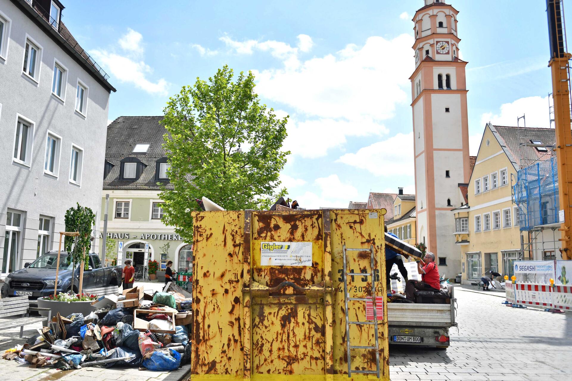 In Schrobenhausens Straßen ist das Wasser zum größten Teil schon wieder verschwunden, nun prägen große Container für den unbenutzbar gewordenen Hausrat das Stadtbild. Es sei aber toll zu sehen, so Hanke, wie viele Freiwillige in den vergangenen Tagen ihre Unterstützung angeboten hätten. „Alle haben zusammengeholfen, das Wasser aus den kirchlichen Gebäuden herauszubekommen“, lobte Jugendpfarrer Stadlmayr die große Solidarität untereinander. Er selbst sei erst am Sonntag nach Schrobenhausen zurückgekehrt und wurde in einer Art und Weise „mit den zerstörerischen Wassermassen konfrontiert“, die er so noch nie gesehen hätte.